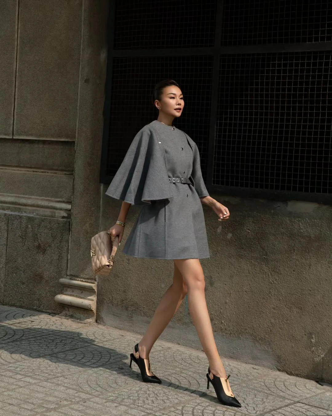 Không cần quá nhiều phụ kiện cầu kỳ, chỉ cần một đôi giày cao gót và chiếc túi da cầm tay là nàng đã hoàn thiện tổng thể thanh lịch nhưng không kém phần sang trọng
