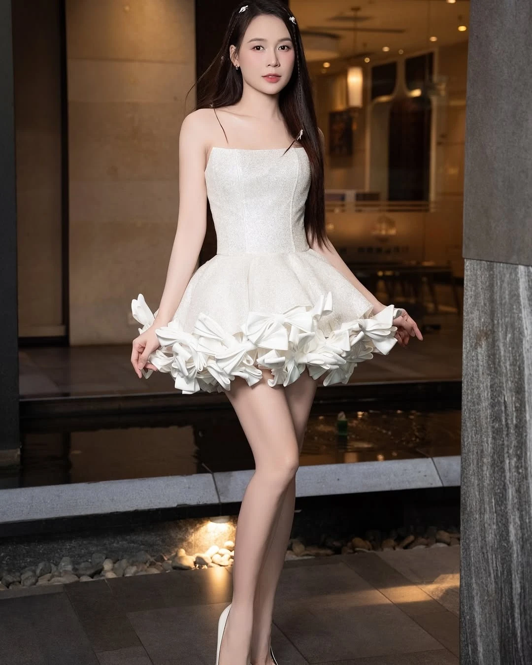 Vẻ quyến rũ của nàng được tôn vinh trọn vẹn qua đầm cúp ngực chiết eo. Sam khéo léo lựa chọn chiếc đầm cúp ngực với sắc trắng tinh khôi để lộ ra xương quai xanh thanh mảnh. Nữ diễn viên duyên dáng lựa chọn dáng đầm xòe điểm xuyết những chiếc nơ nhỏ góp phần tôn hình tượng ngọt ngào.