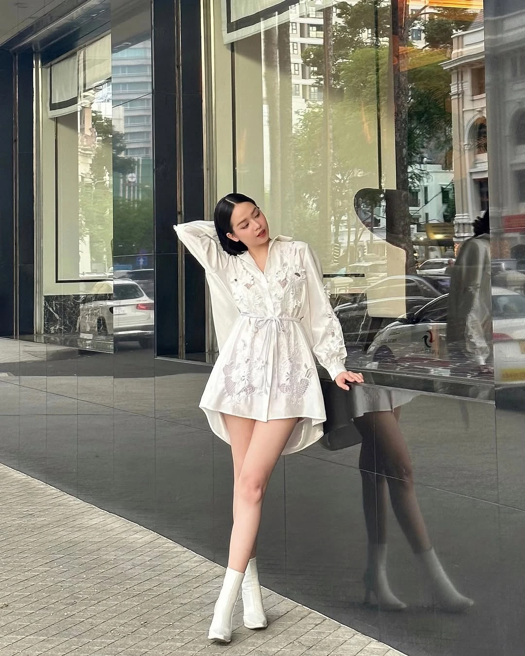 Khác với nét đẹp trẻ trung, Thanh Hằng lựa chọn chiếc đầm mang tinh thần thời thượng hơn cả. Phom dáng sơ mi phối cùng bản đai chiết khéo léo và tà áo xếp ly tinh tế khiến nàng mẫu tỏa sáng mọi khung hình