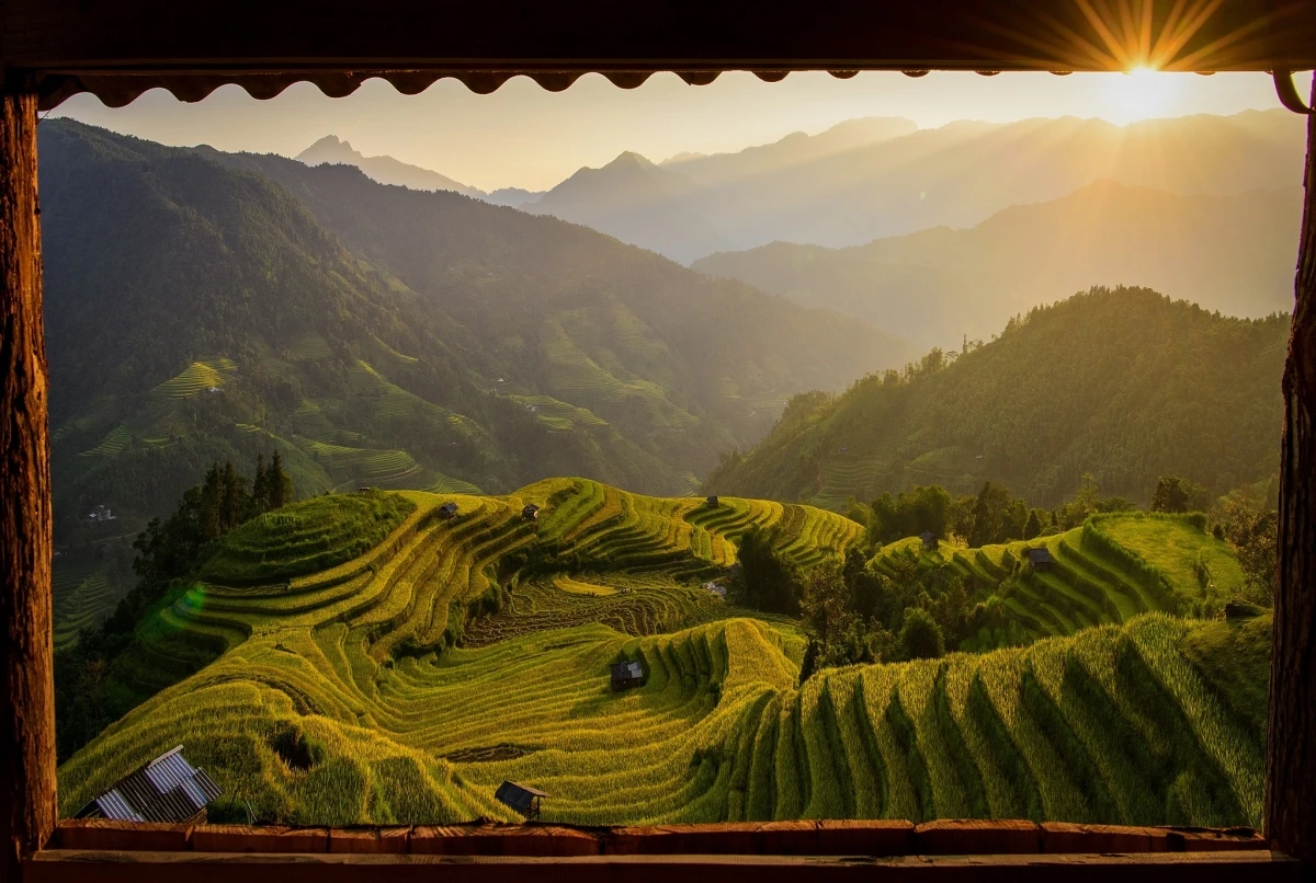 Ảnh chụp khung cảnh ruộng bậc thang dưới nắng sớm ở mâm xôi Nậm Khoà, xã Hồ Thầu. Nhìn từ khung cửa sổ, những thửa ruộng uốn lượn, xếp tầng lên nhau, ôm lấy những quả đồi.