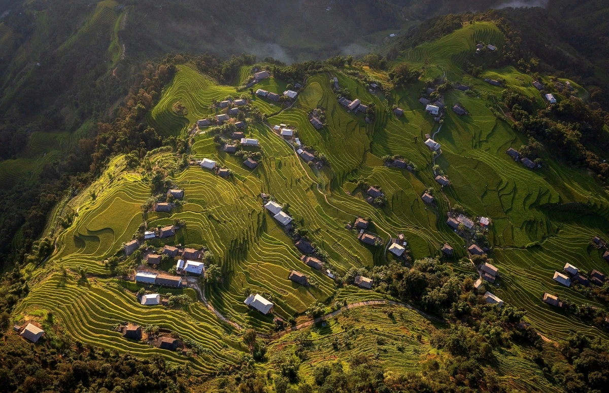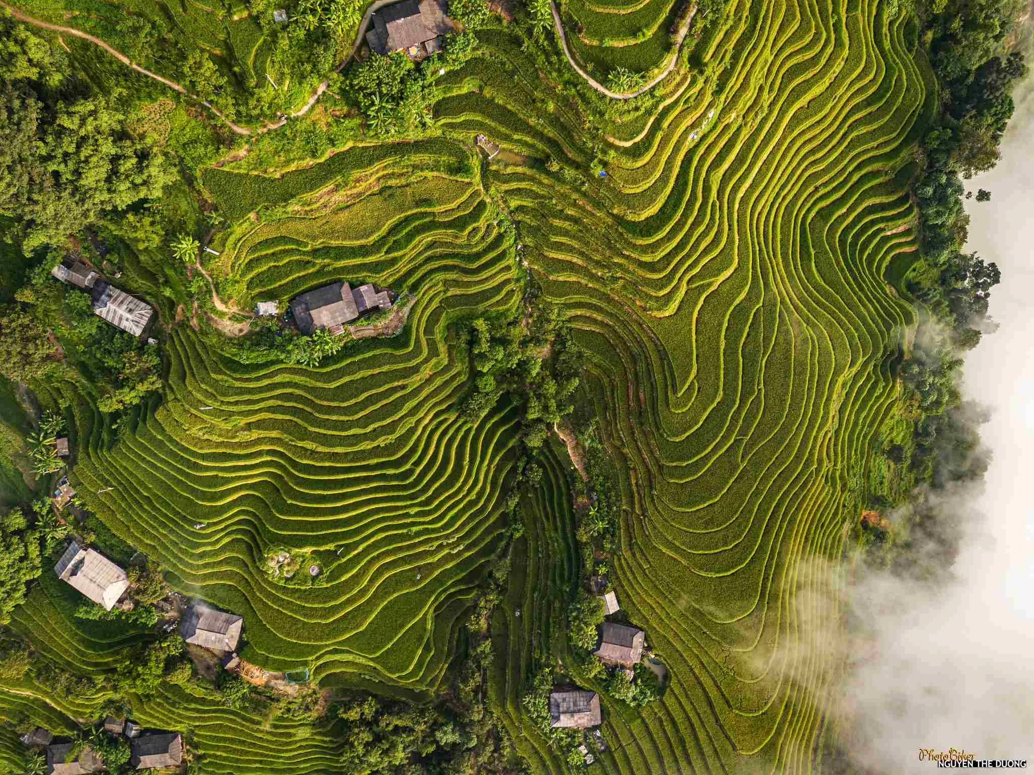 Từ chân núi đến đỉnh đồi, các thửa ruộng bậc thang nối tiếp nhau uốn lượn. Xen giữa những thửa ruộng là những ngôi nhà sàn truyền thống của đồng bào La Chí, tạo nên một khung cảnh vừa hùng vĩ, vừa bình yên. Ảnh: Nguyễn Thế Dương
