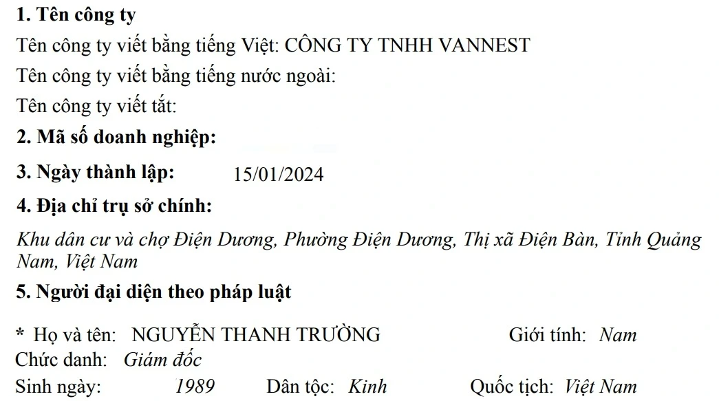 Theo Cổng thông tin Quốc gia về đăng ký doanh nghiệp, Công ty TNHH Vannest thành lập từ tháng 1/2024 có trụ sở tại phường Điện Bàn Đông, TP Đà Nẵng. Doanh nghiệp có ngành nghề kinh doanh chính là bán buôn đồ dùng khác cho gia đình.