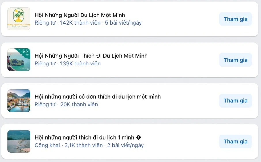 Trên Facebook có nhiều hội nhóm du lịch một mình, nơi các bài viết chia sẻ trải nghiệm nhận được nhiều lượt tương tác và bình luận từ cộng đồng