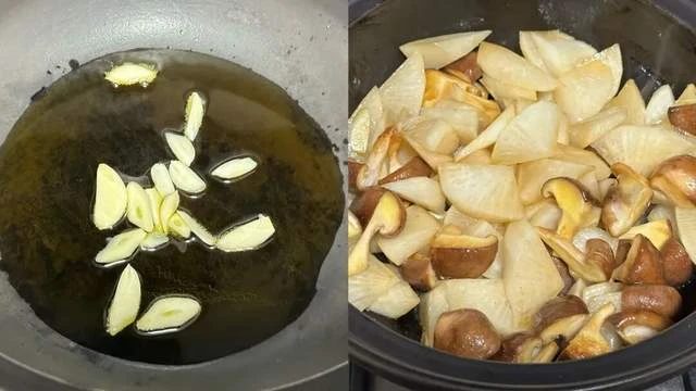 Bước 2: Cho một ít dầu ăn vào nồi, phi thơm tỏi. Sau đó cho củ cải trắng và nấm hương vào xào đều. Thêm muối và nước tương rồi tiếp tục xào đều cho ngấm gia vị. Sau đó bạn cho thêm một bát tô nước sôi vào rồi đậy nắp, đun nhỏ lửa cho đến khi củ cải chín mềm. Thời gian đun khoảng 8-10 phút.