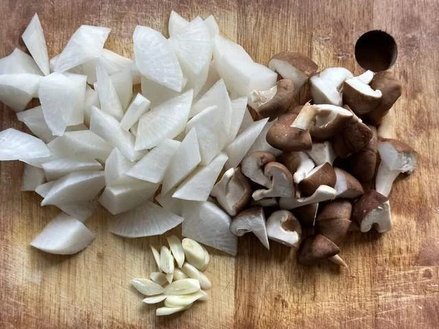 Bước 1: Gọt vỏ củ cải trắng, rửa sạch rồi cắt thành từng miếng vừa ăn. Rửa sạch và cắt nấm hương thành từng miếng, thái nhỏ tỏi thành các lát. Phần há cảo trứng bạn có thể băm 150g thịt, trộn với một chút hành lá thái nhỏ, muối ướp khoảng 15 phút. Sau đó đập 2 quả trứng vào bát, đánh tan. Đun sôi dầu trong chảo rồi dùng một chiếc muôi tròn làm khuôn, đổ lượng trứng vừa phải vào muôi, xoay đều để tạo thành lớp vỏ há cảo. Sau khi lớp vỏ trứng đông lại bạn cho một ít nhân vào rồi gập đôi lại. Làm lần lượt cho đến khi hết nguyên liệu.