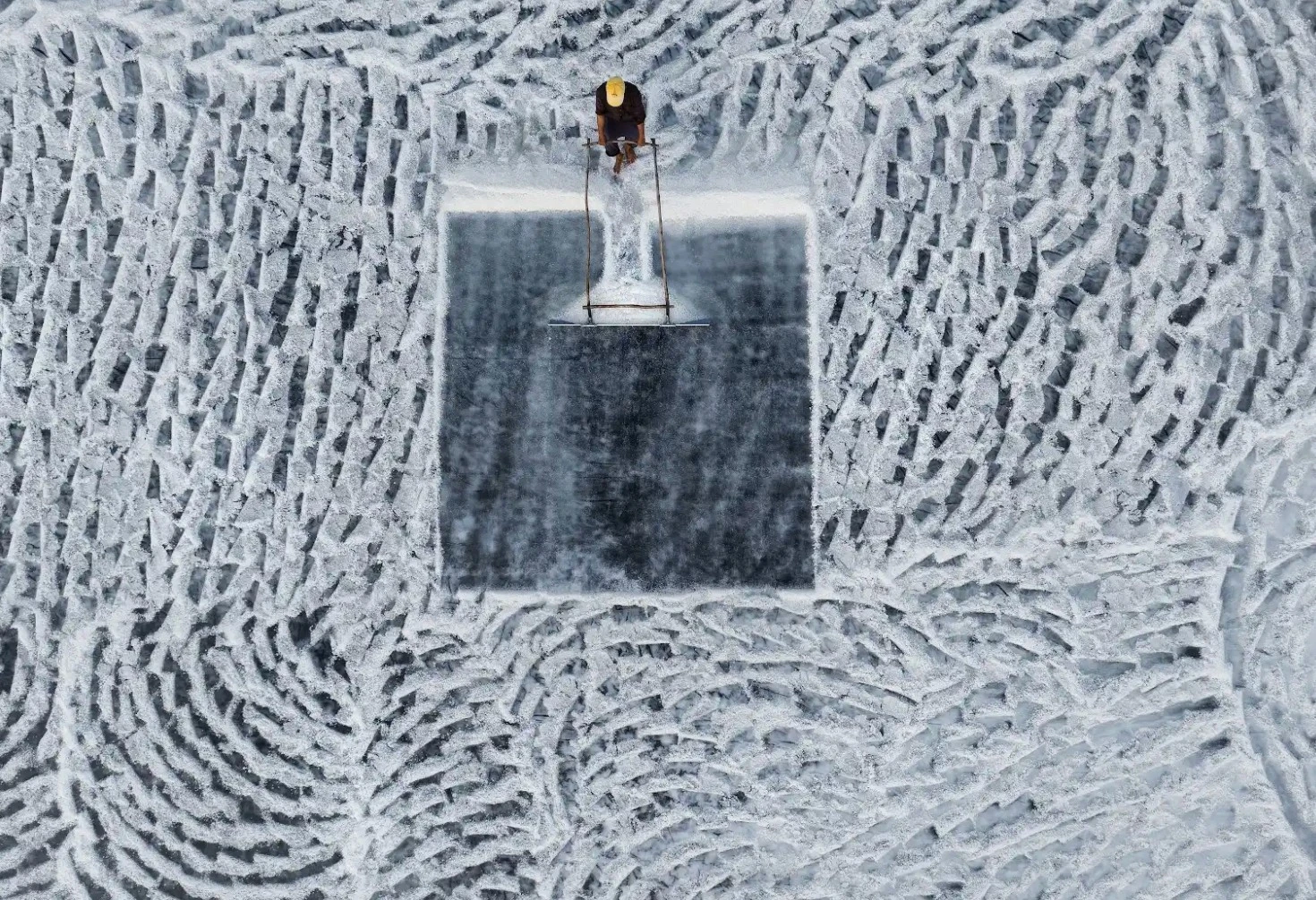 Nông dân bên ruộng muối (Ảnh chụp từ trên cao)