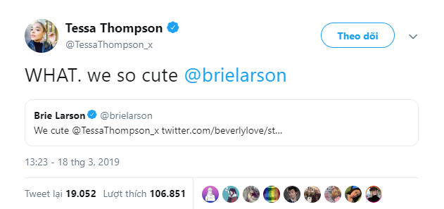 Trước đó, dường như nàng Valkyrie không cập nhật nhanh lẹ đến vậy, có vẻ nàng còn không biết đến sự tồn tại của văn hóa “chèo thuyền” và không nhận ra rằng mình đang được “ship” với Carol. Khi tờ Los Angeles Times hỏi về tấm fanart mà Brie đã tweet lại, Thompson trả lời khá ngây ngô: “ Chúng thật tự do làm sao . Nhưng việc này thậm chí còn chưa xảy ra với tôi cơ mà, nhưng về lý mà nói thì đây thực sự là một điều rất lãng mạn. T ôi thậm chí còn không biết nhiều về các vũ trụ hay các nhân vật giao nhau, cơ mà tôi thích ý tưởng các nhân vật nữ Marvel sẽ gặp nhau lắm. “