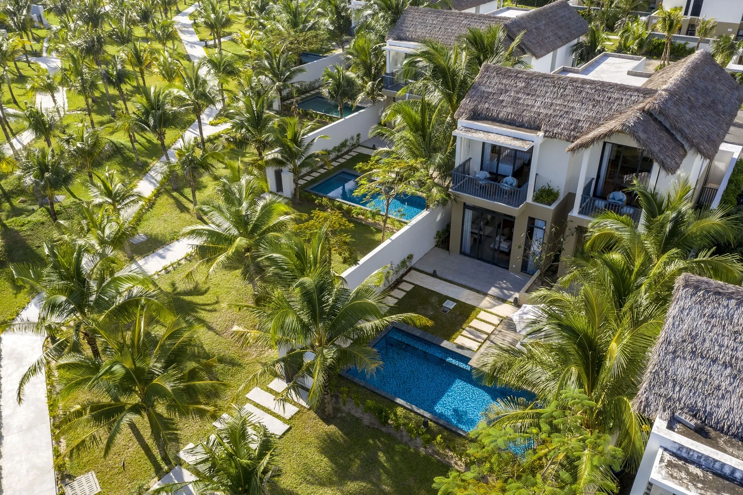100% villa trong khu nghỉ đều có hồ bơi riêng, cùng hồ trung tâm dài hơn 120m được ví như một công viên nước thu nhỏ - nơi du khách vừa thư giãn, vừa vui chơi cùng con trẻ. Các không gian mở được thiết kế để cha mẹ dễ dàng quan sát con, trong khi trẻ nhỏ có thể thoải mái chạy nhảy và khám phá mà không lo nguy hiểm.