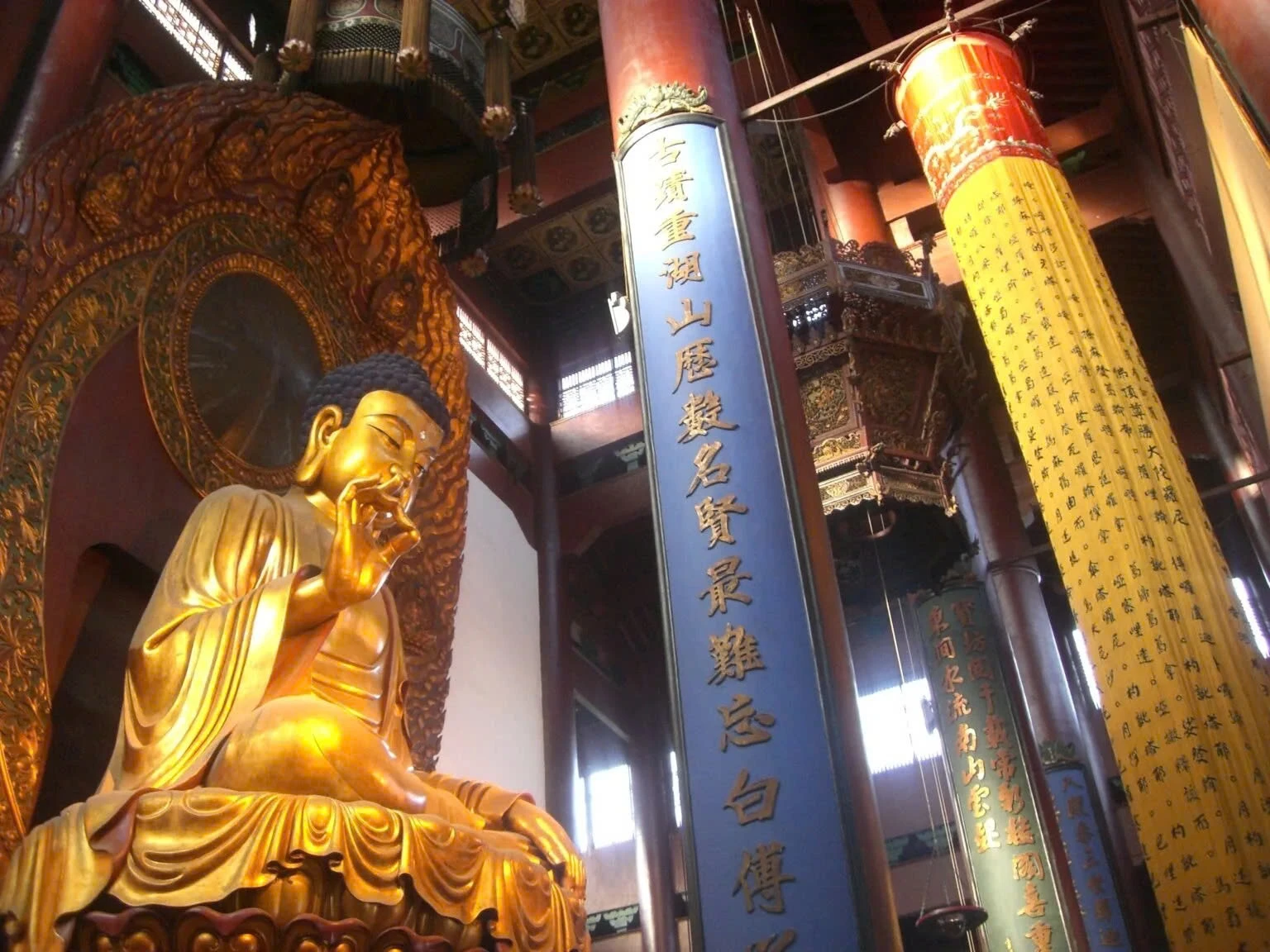 | Chính điện là nơi đặt bức tượng Phật tráng lệ, một trong những bức tượng Phật trong nhà cao nhất Trung Quốc. Hai bên bức tượng là 20 vị thần hộ mệnh với những biểu cảm và tư thế chi tiết cho thấy tay nghề thủ công xuất chúng. Chính điện này tiêu biểu cho phong cách kiến trúc thời nhà Tống với mái ngói hai tầng và những cột gỗ chắc chắn. Ảnh: @travelchinawithme. |