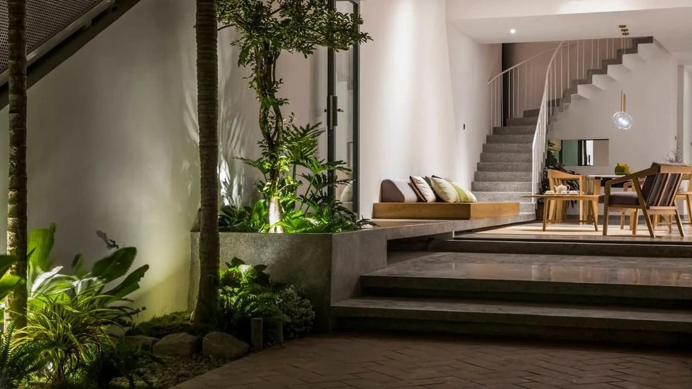 Khi thiết kế không gian mở không thể bỏ qua những không gian sống "xanh". Việc các khu vực được kết nối tạo nên sự hài hòa, giao thoa giữa bên ngoài và bên trong, giúp những làn gió mát, xanh, tự nhiên thổi vào nhà. Cây xanh ngoài trời và cây trồng trong nhà giúp không khí trong lành và có lợi cho sức khỏe con người. Không gian mở tận dụng ánh sáng và không khí tự nhiên luôn mang lại cảm giác thư thái, xua tan mệt mỏi khi làm việc.
