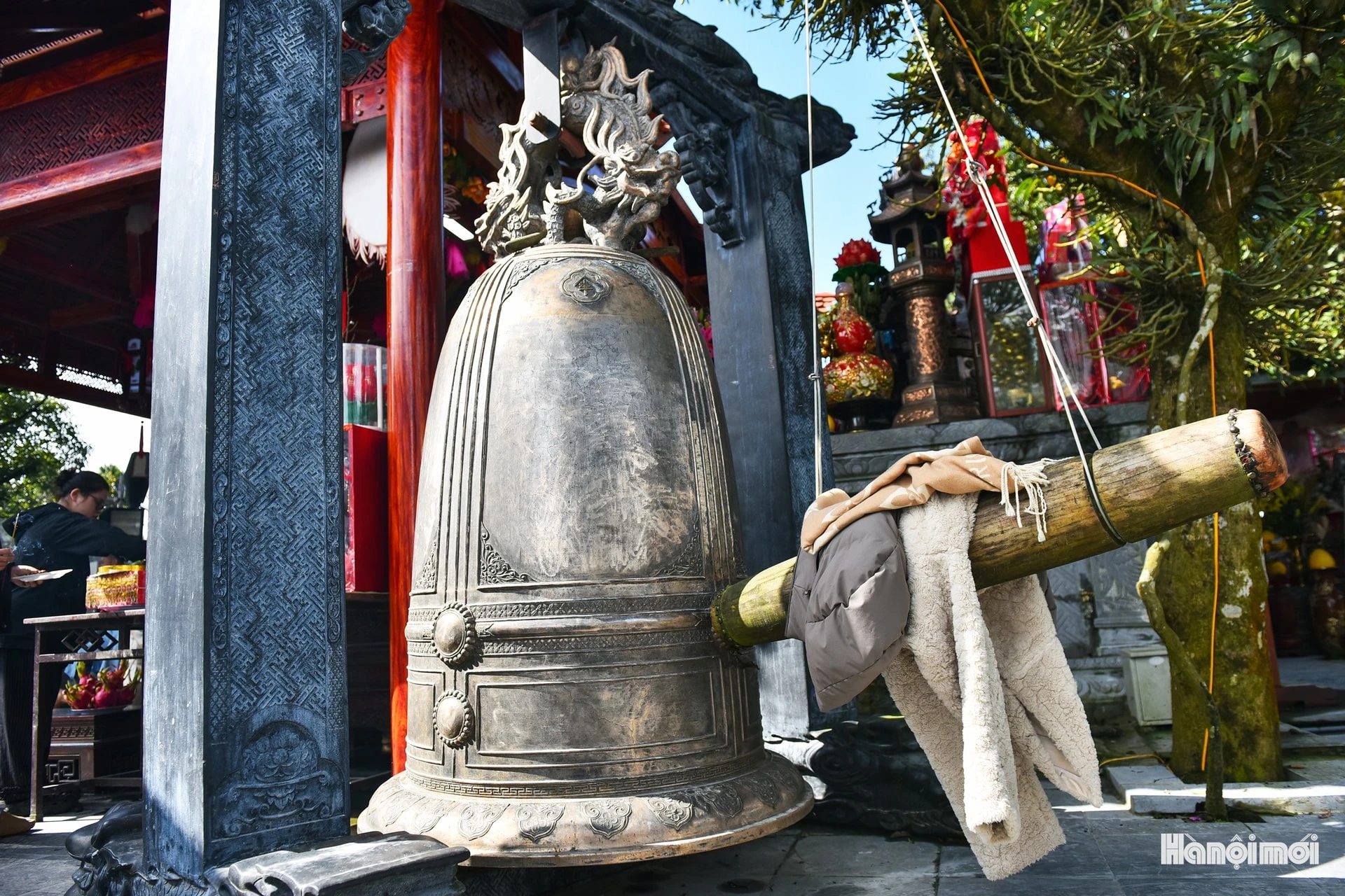 Chiếc chuông đồng lớn trước sân đền ngân vang giữa mây núi, như đánh thức sự an yên trong lòng người lữ khách.