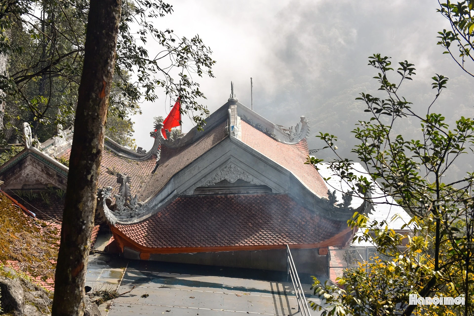 Mái đền thấp thoáng giữa sương mây tạo nên khung cảnh huyền ảo, nơi ranh giới giữa đất và trời dường như tan vào nhau.