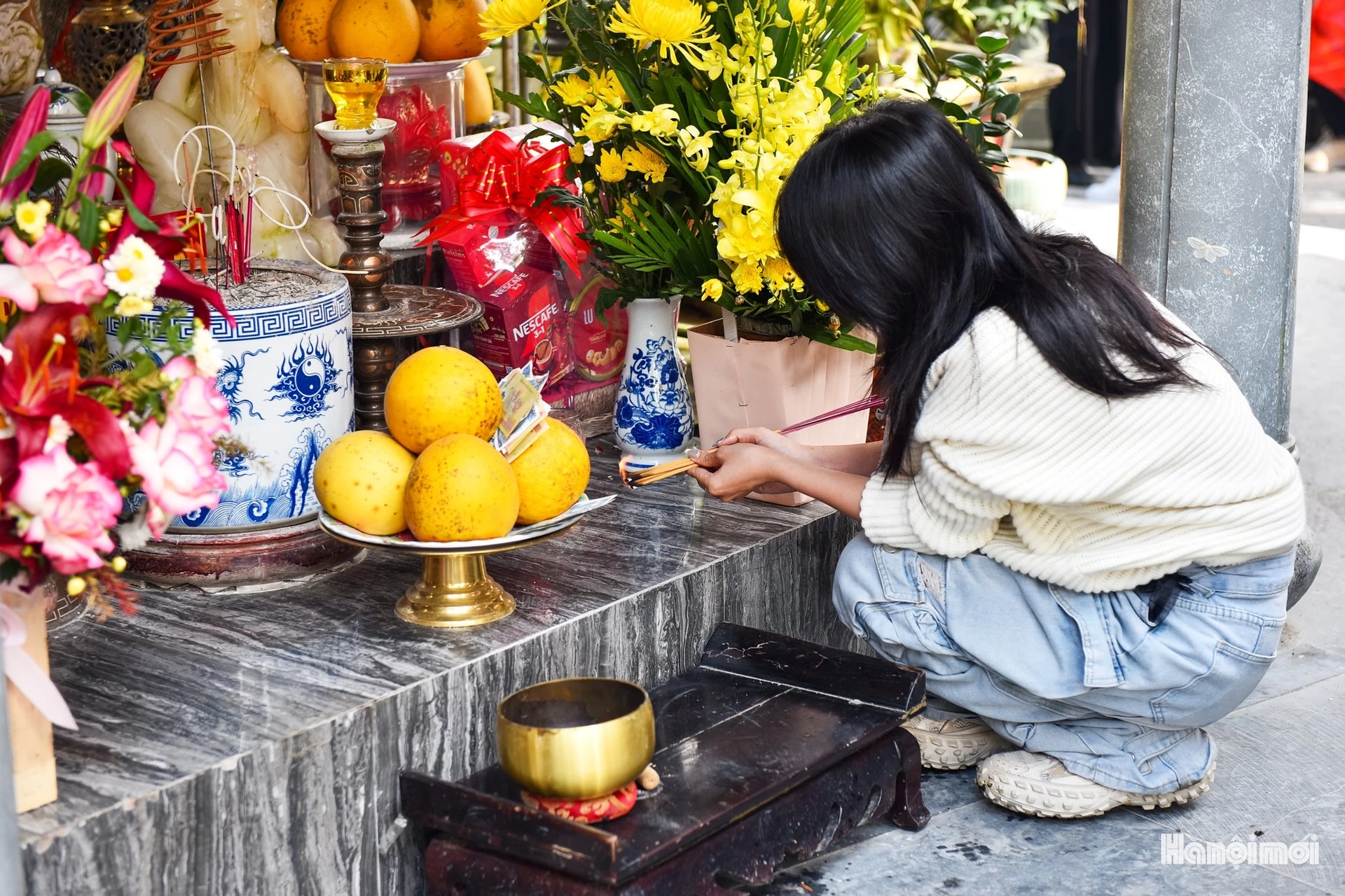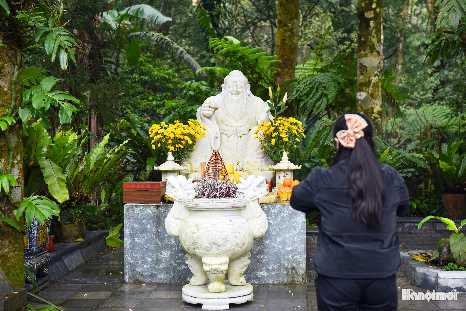 Ngồi nép bên ban thờ, người hành hương cẩn thận châm từng nén hương dâng lễ.