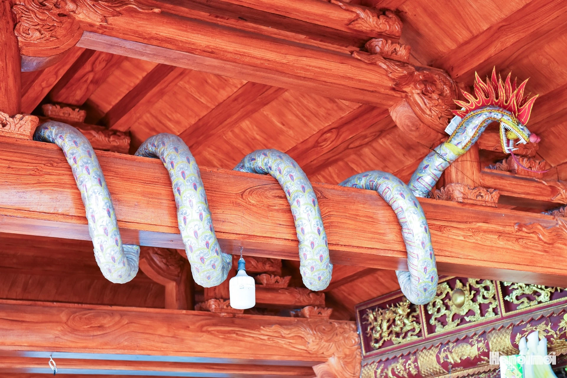 Hình tượng “bạch xà” trên kèo mái đền mang ý nghĩa bảo hộ, thể hiện nghệ thuật trang trí truyền thống trong kiến trúc tín ngưỡng vùng núi Ba Vì.