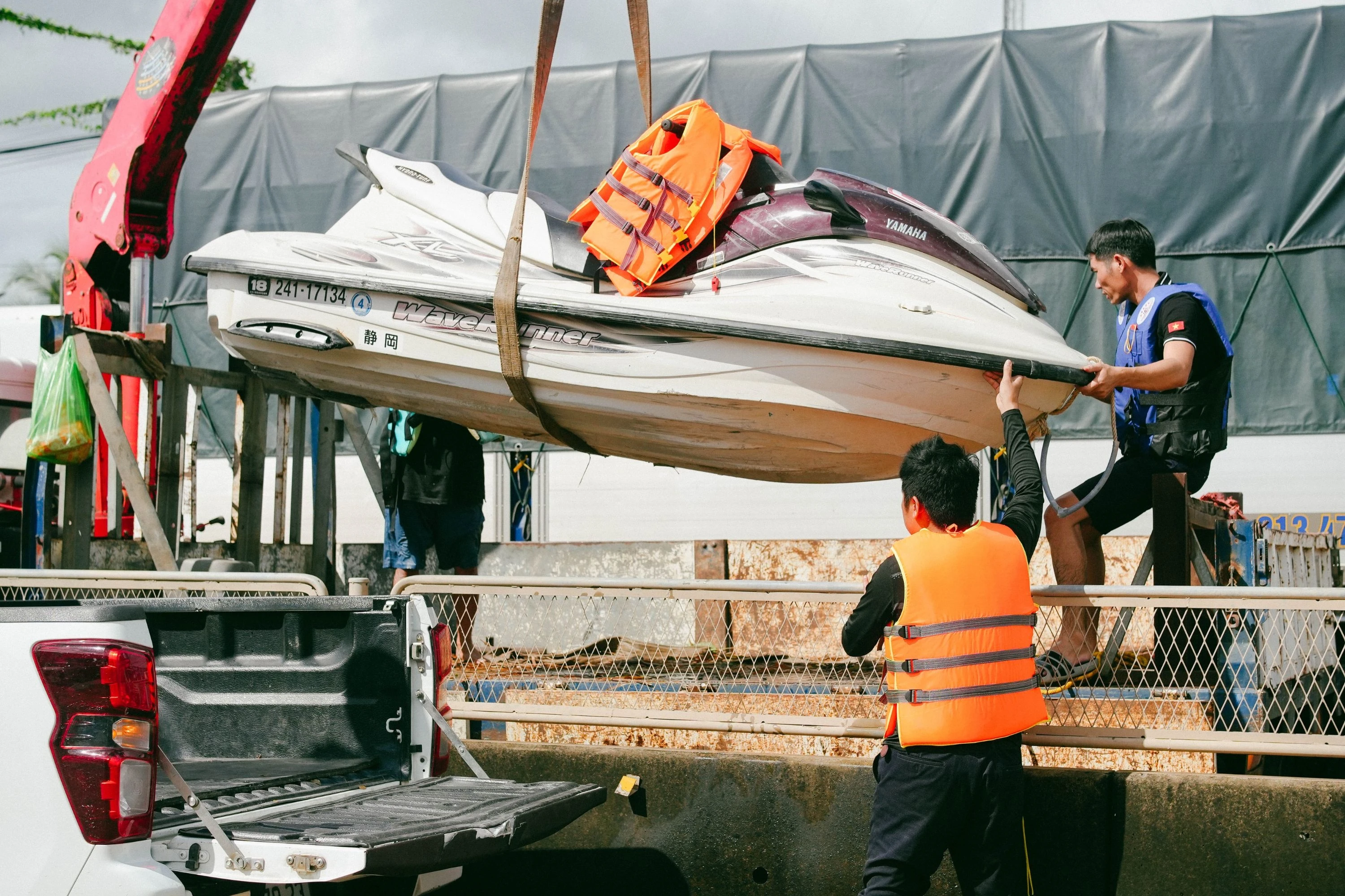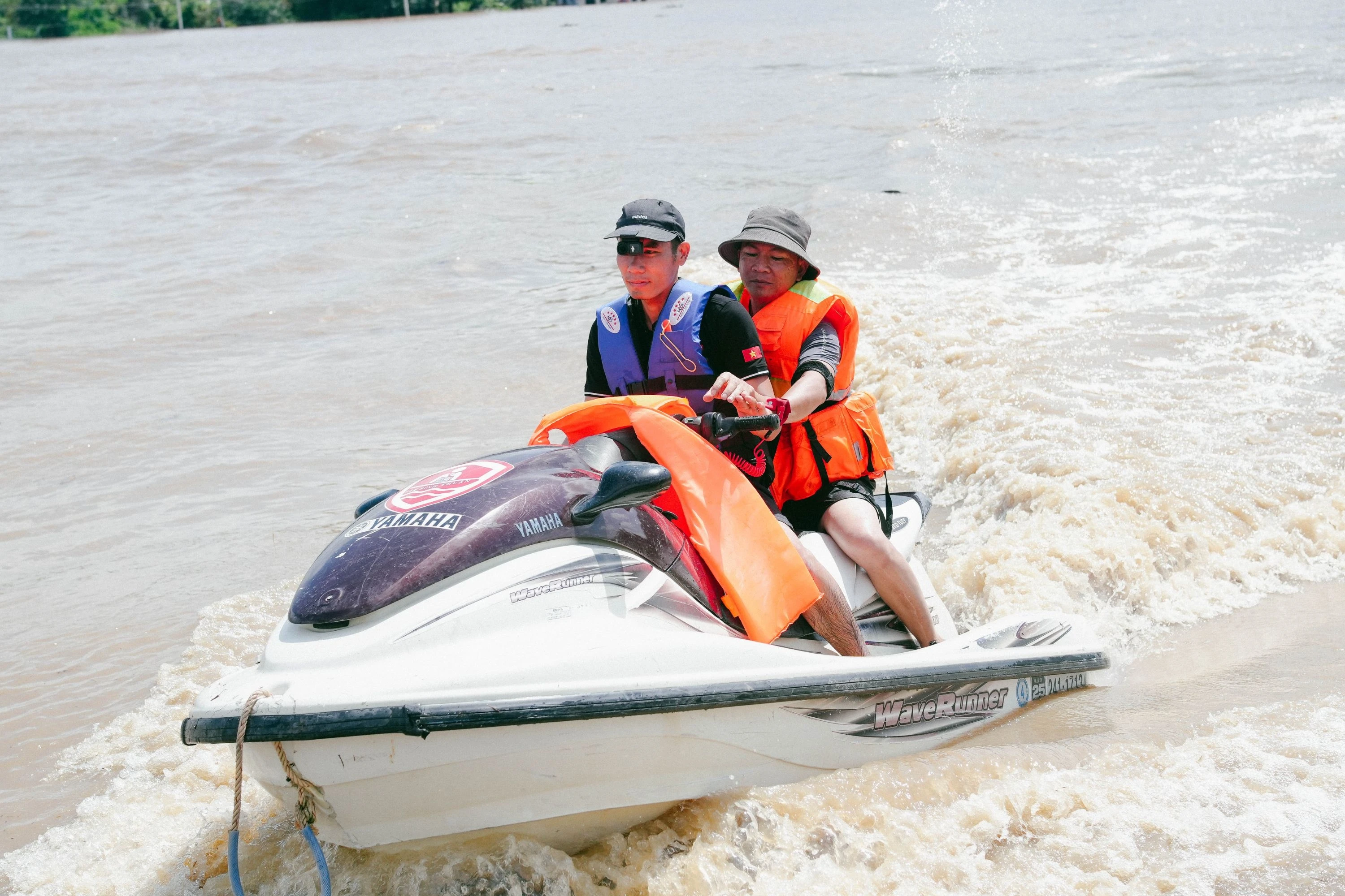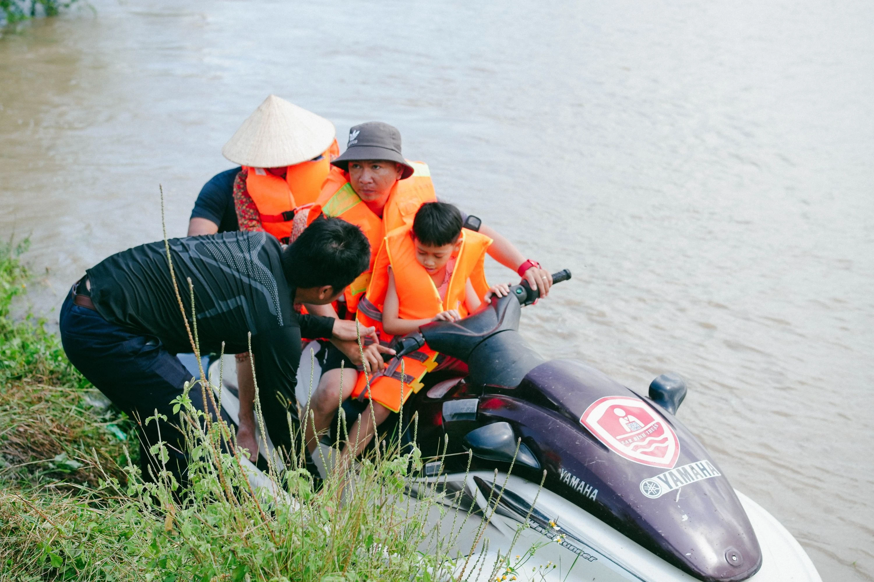 Hình ảnh đội cứu hộ của anh Sơn phối hợp cơ quan chức năng phường Hàm Thắng đưa một gia đình có trẻ con ra khỏi vùng ngập nặng lúc 20h tối 4/12. Toàn đội huy động 1 xe cứu thương, 2 xe bán tải chở 2 jet ski đi giải cứu người dân.