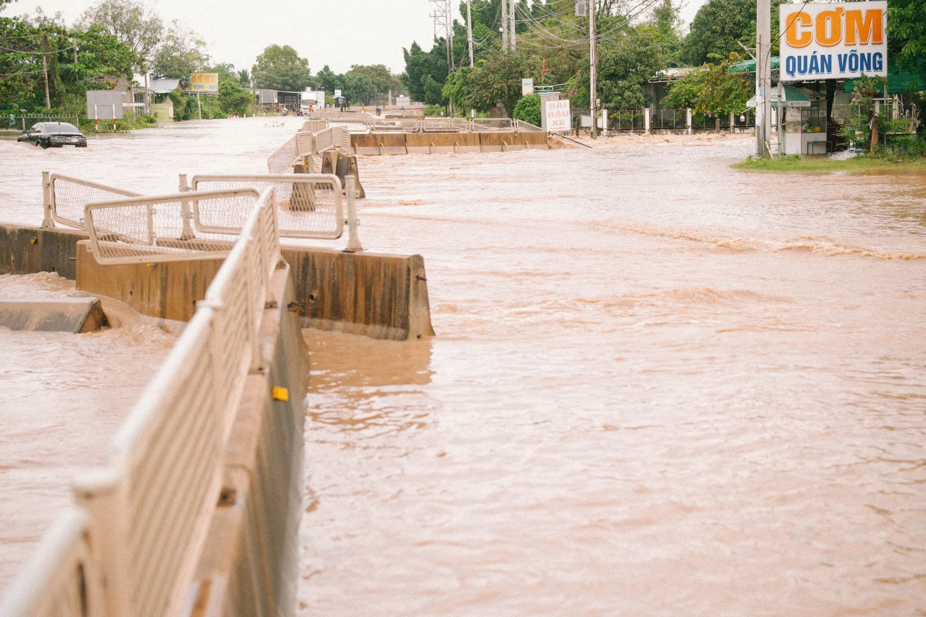 Nước lũ dâng nhanh và mưa lớn từ đêm 3/12 khiến Quốc lộ 1, đoạn gần ngã ba Gộp, xã Hồng Sơn, tỉnh Lâm Đồng (Bình Thuận cũ), chìm trong biển nước. Một số điểm ngập sâu tới 1 m, thậm chí hơn 2 m, cuốn trôi nhiều đồ đạc của người dân.