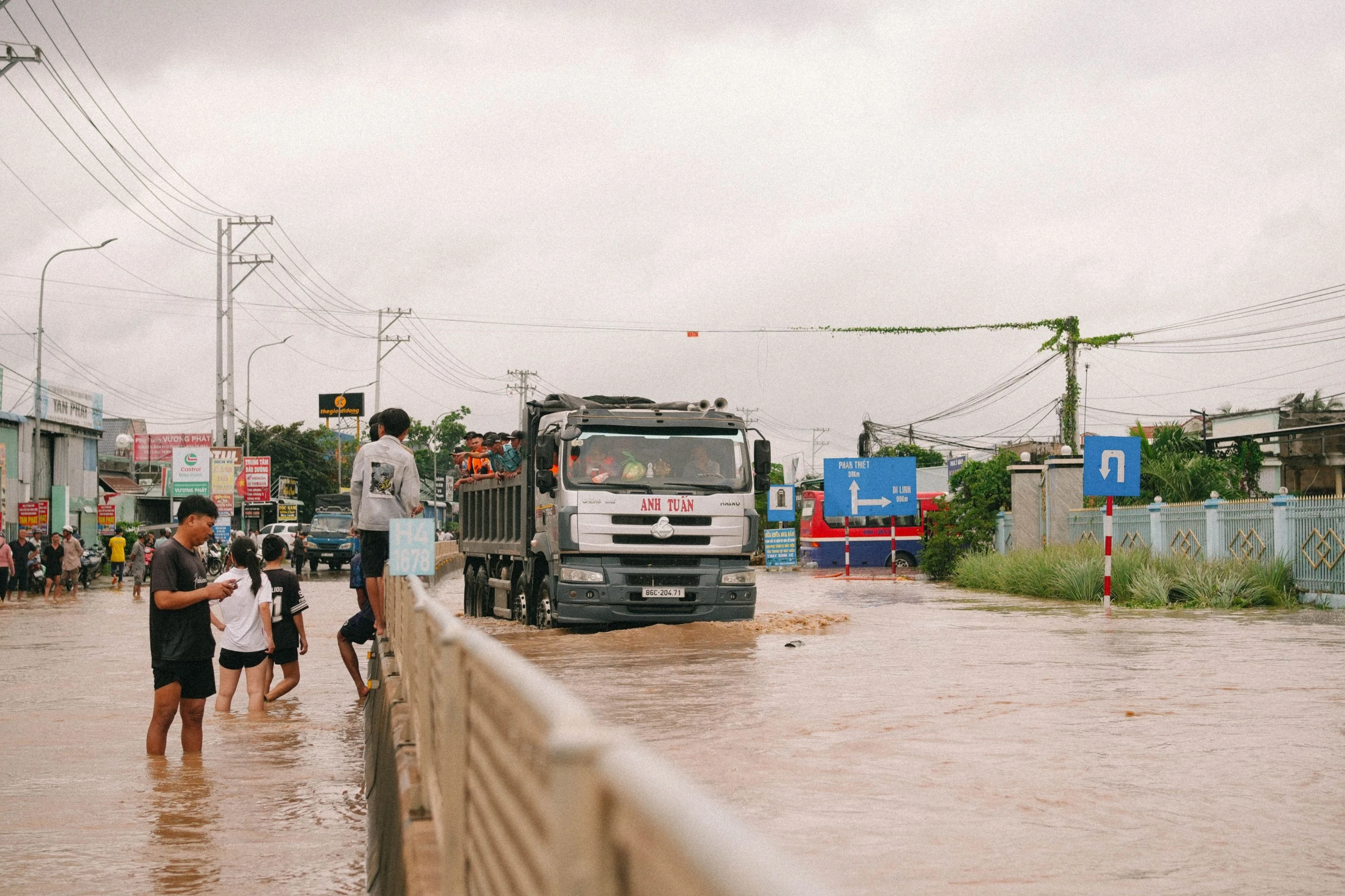 Trong nhiều giờ, các xe tải gầm cao được huy động để chở lực lượng cứu hộ vượt qua đoạn ngập. Không ít người dân hiếu kỳ dừng lại ghi lại cảnh tượng ngập hiếm gặp.