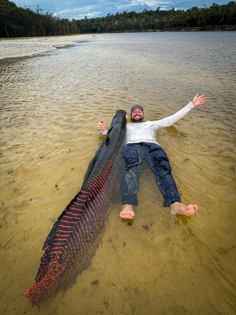 Alexandre Augusto Dick, đến từ Brusque, Santa Catarina, đã bắt được một con cá pirarucu hay còn gọi là cá hải tượng long khổng lồ dài hơn 2,2 mét, nặng 130kg ở vùng nước sông Itapará, Brazil.