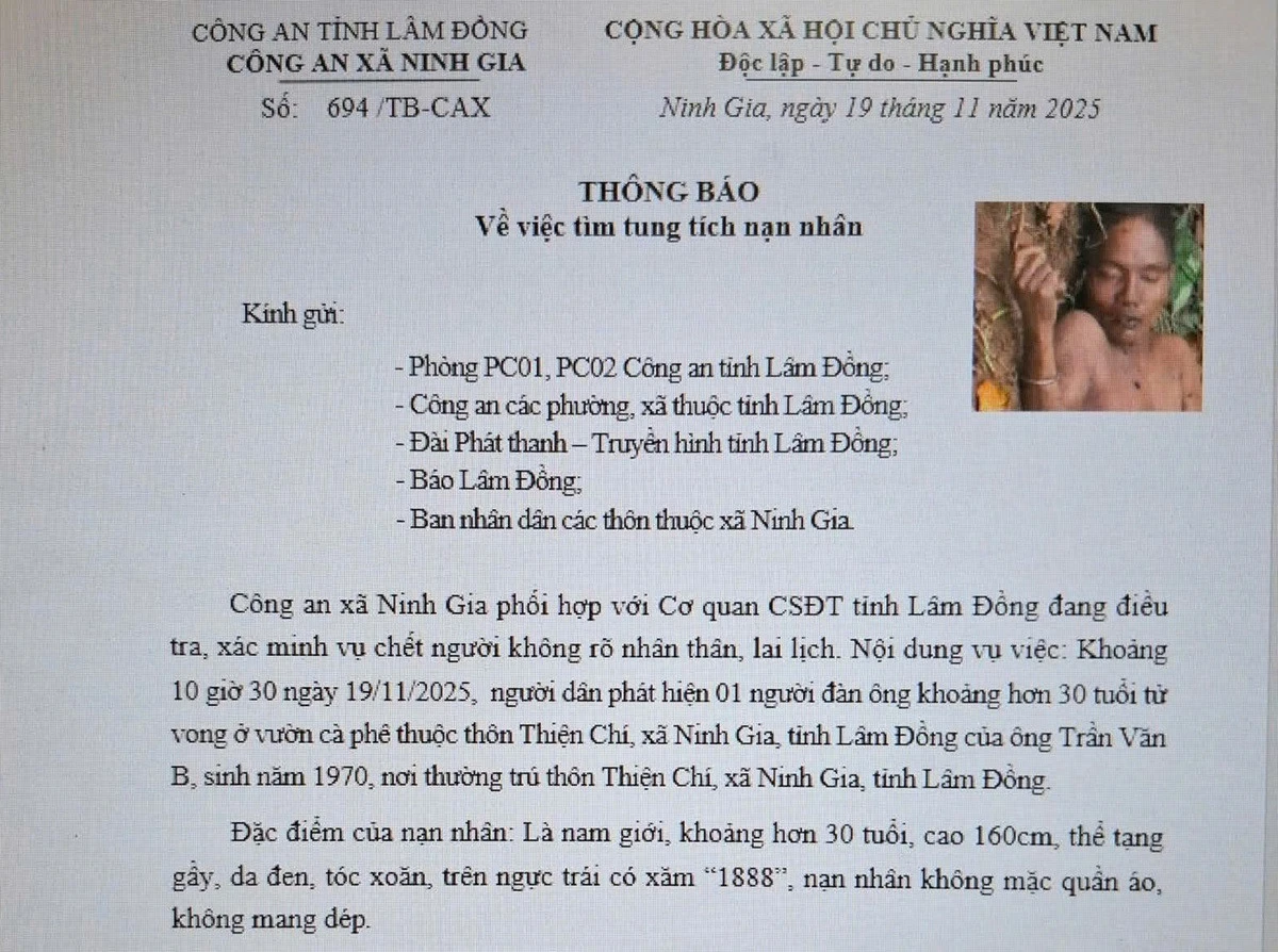 Công an xã Ninh Gia phát thông báo tìm danh tính nạn nhân. Ảnh: CACC