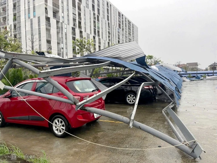 Gần đó, mái che khu để ôtô ven biển Thiên Cầm đổ sập, phủ kín dãy xe. Thiệt hại chưa được thống kê. Ảnh: Đức Hùng