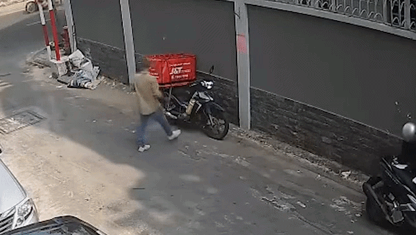 Theo nội dung từ clip, trong lúc nam shipper đậu xe máy trong hẻm để đi giao hàng, thì một người đàn ông tiếp cận, leo lên xe và nổ máy rời đi.