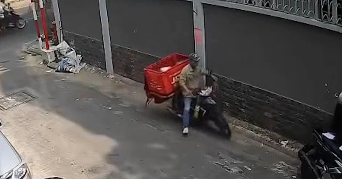 Cùng ngày, người dùng mạng xã hội lan truyền clip ghi lại cảnh nam shipper bị người đàn ông trộm mất xe máy đang đậu trong hẻm cùng chiếc giỏ chứa các đơn hàng.