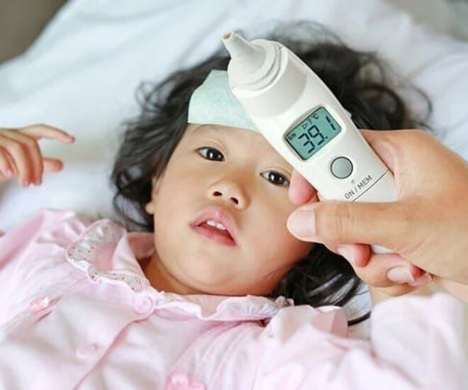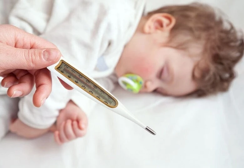 Trẻ bị tay chân miệng có hiện tượng sốt cao, đặc biệt là giật mình thì cần đưa đến viện ngay. Ảnh minh họa.
