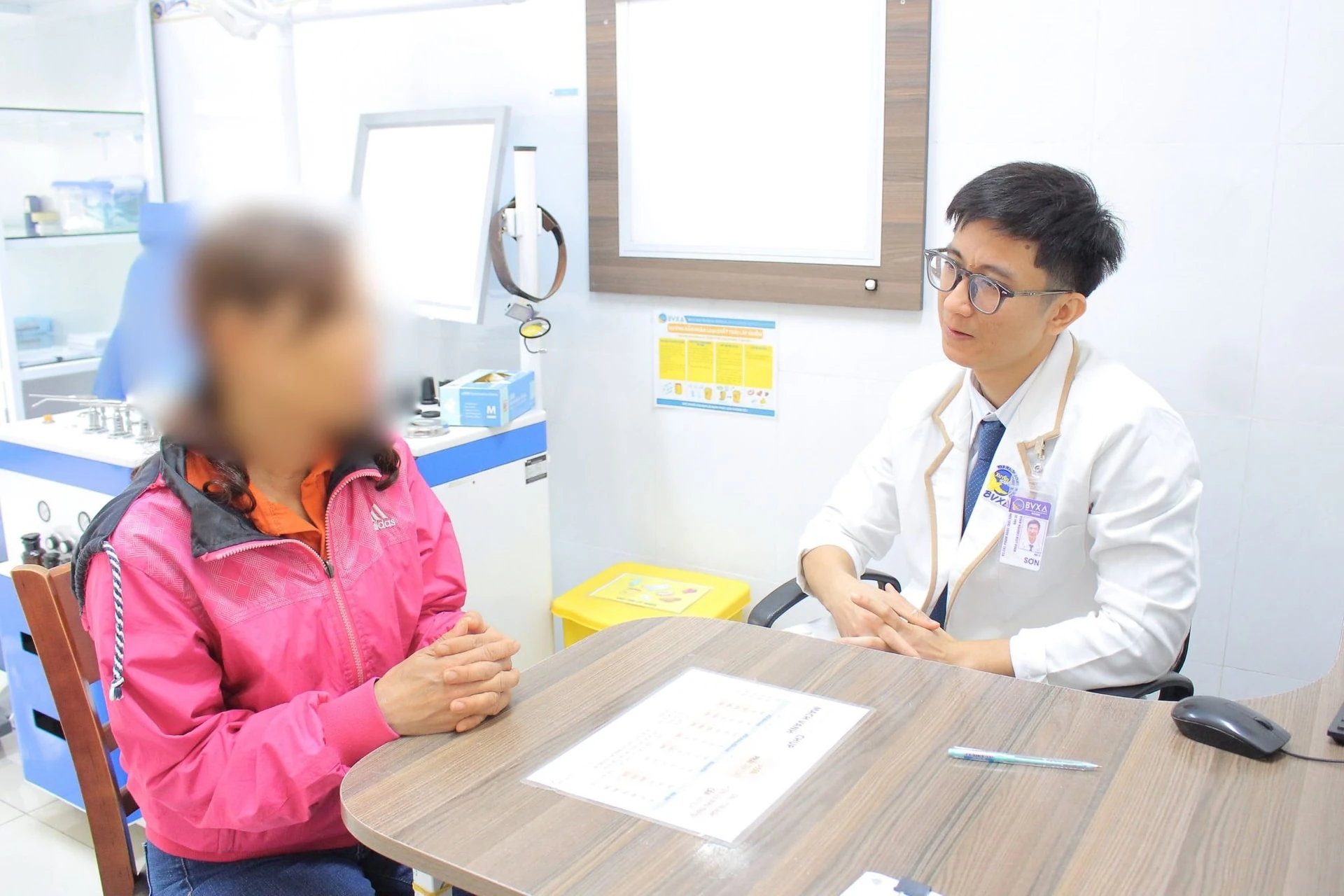 Nội soi ở Bệnh viện Đa khoa Xuyên Á Đức Hòa, bác sĩ phát hiện khối nang tròn 2-4 mm ở 1/3 giữa dây thanh trái, bề mặt trơn, màu trắng đục; hai dây thanh di động tốt nhưng dây phải phù nhẹ.