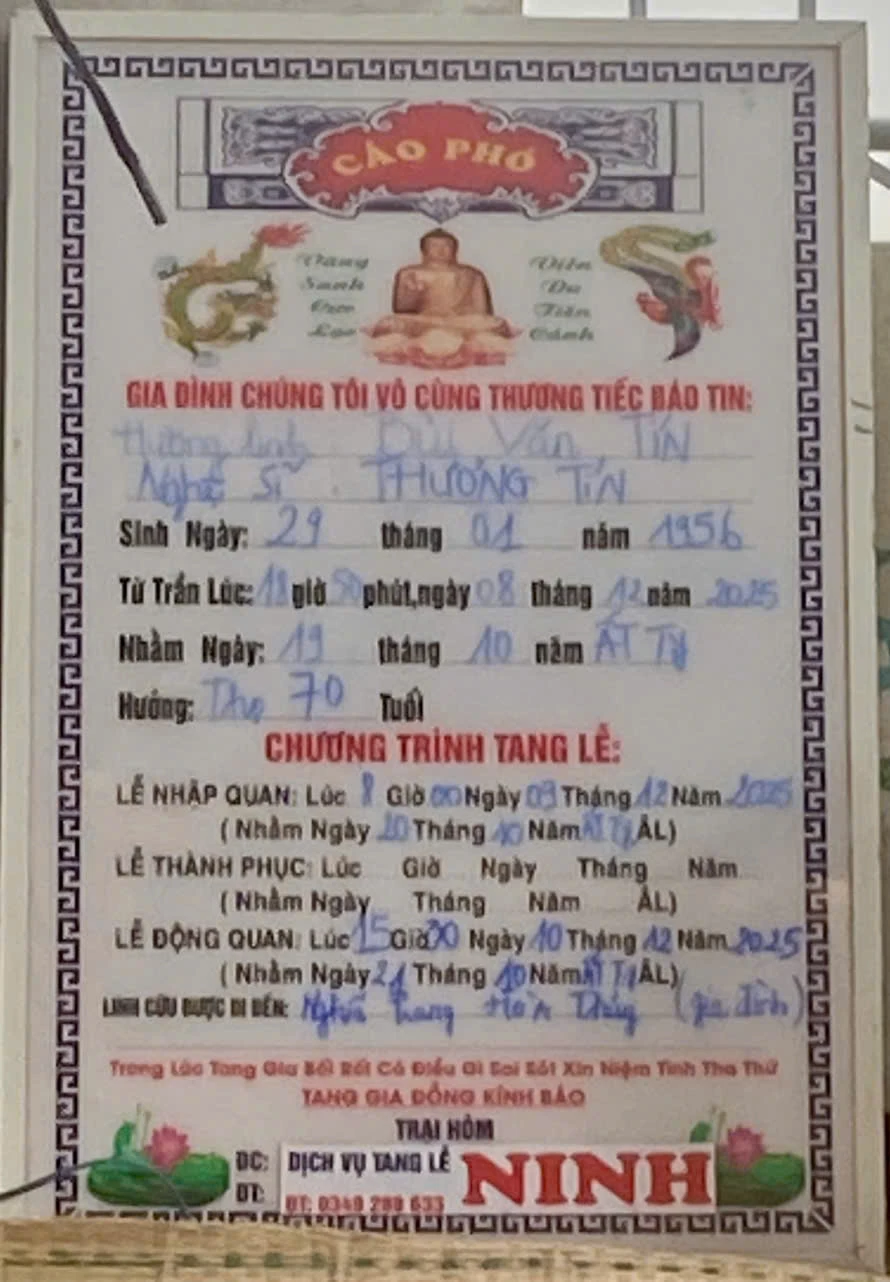 Thông tin tang lễ của nghệ sĩ Thương Tín . Ảnh: Nhạc sĩ Tô Hiếu cung cấp
