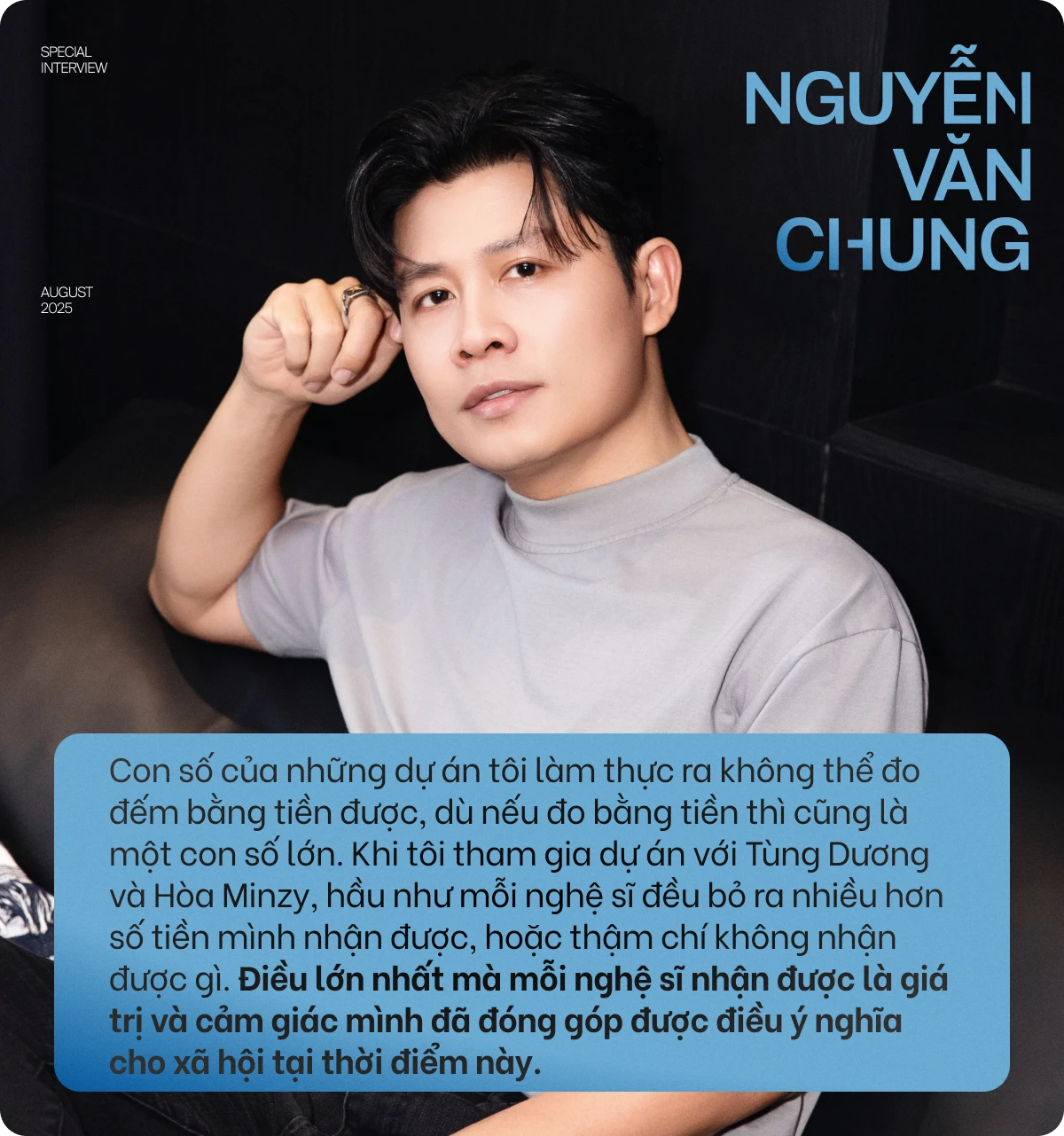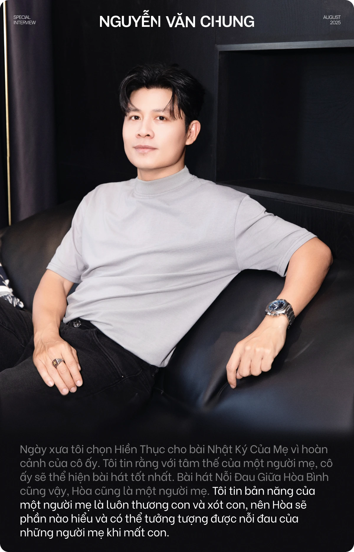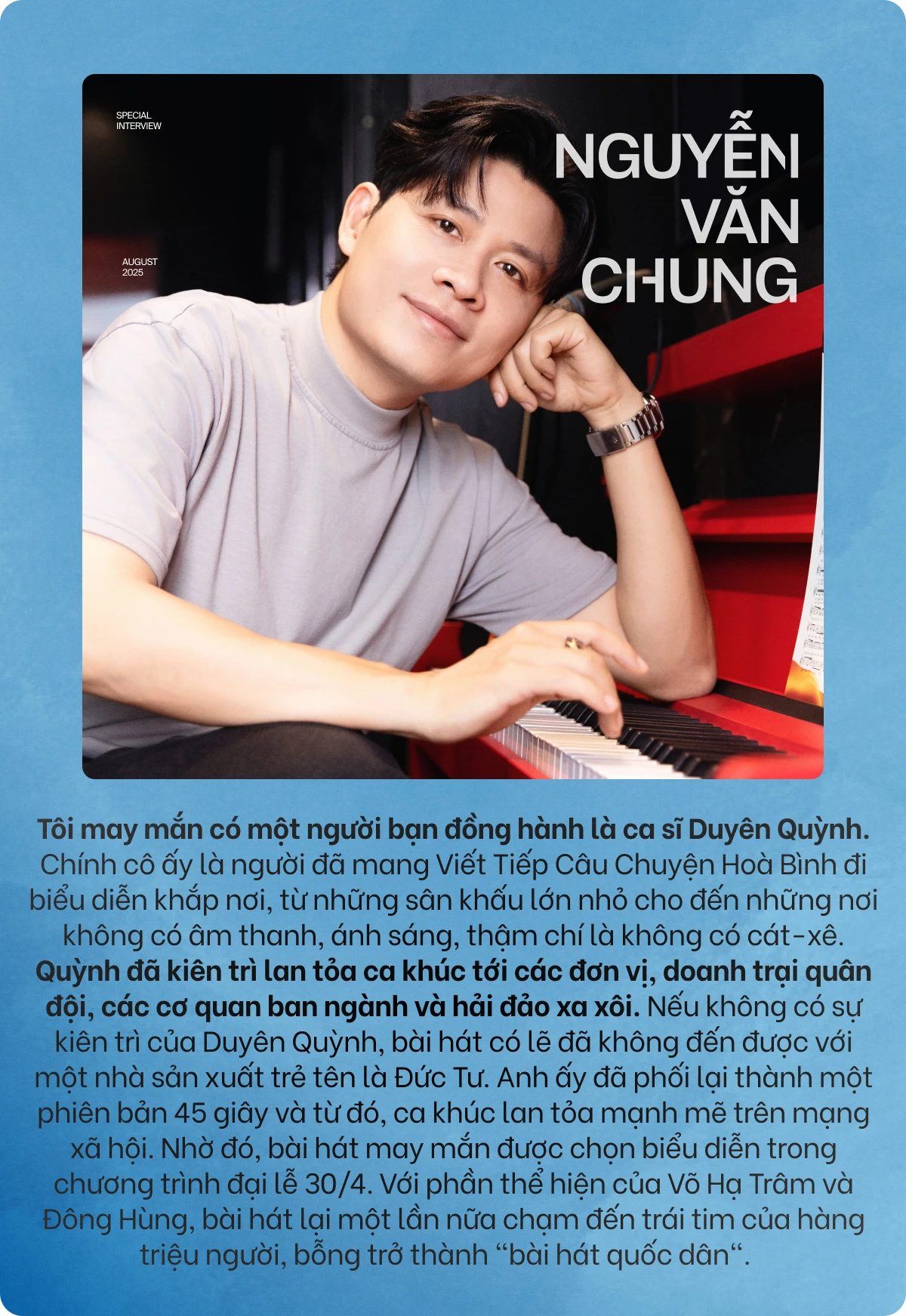 Hai ca khúc của Nguyễn Văn Chung gây sốt từ Đại lễ 30/4 cho đến hiện tại là 2/9. Trong cuộc trò chuyện trò chuyện với chúng tôi, Nguyễn Văn Chung đã mở lòng về những câu chuyện chưa kể, những lý do thầm kín đằng sau mỗi sáng tác, từ cảm xúc vỡ òa khi một bài hát trở thành hiện tượng, đến áp lực khi viết nhạc theo nhiệm vụ, và cả sự bất ngờ khi giọng ca của Tùng Dương hay Hòa Minzy đã thổi một làn gió mới, khiến những ca khúc mang đậm tính chính luận trở nên gần gũi và đầy cảm xúc. Tất cả tạo nên một Nguyễn Văn Chung không ngừng thay đổi, không đi ngược xu thế, mà đơn giản là tạo ra con đường riêng, để mỗi nốt nhạc vang lên đều là một câu chuyện rất thật của chính cuộc đời anh.