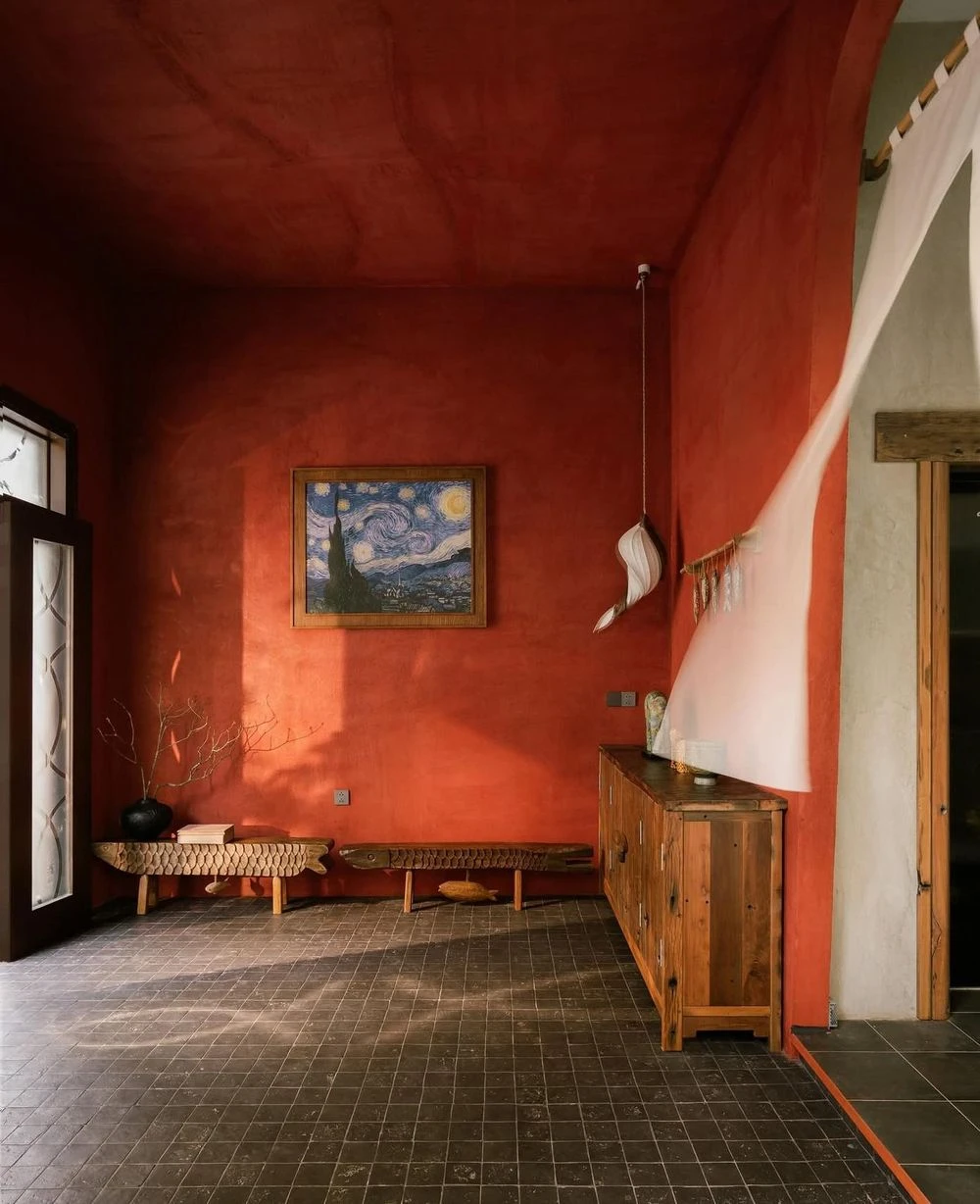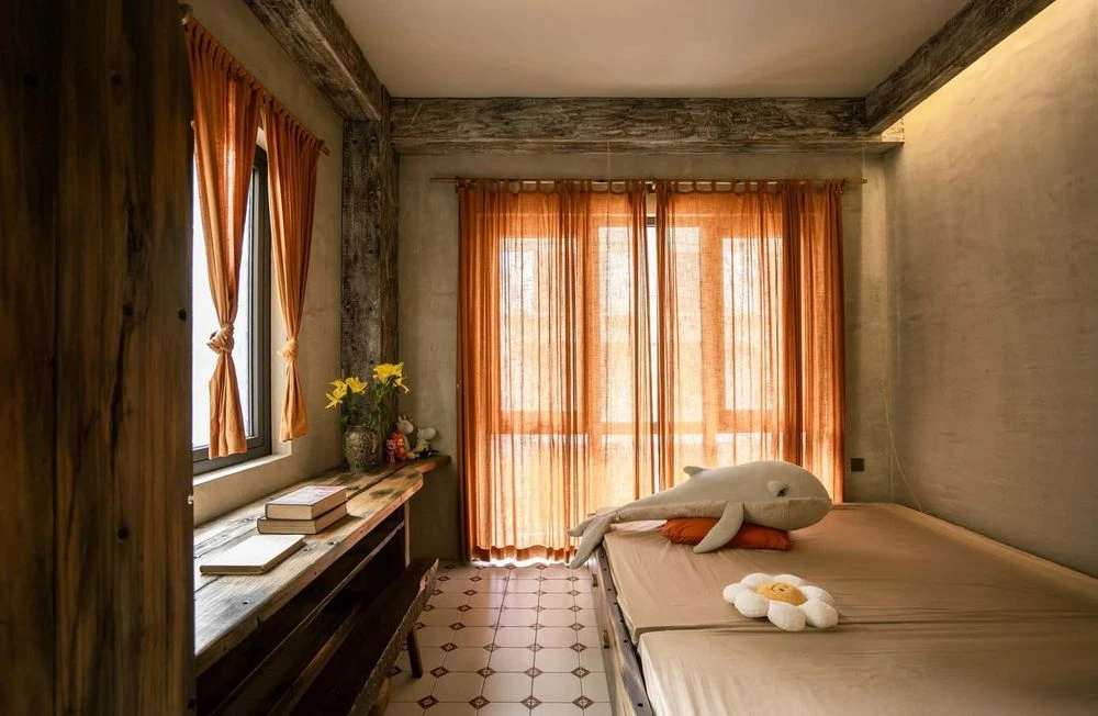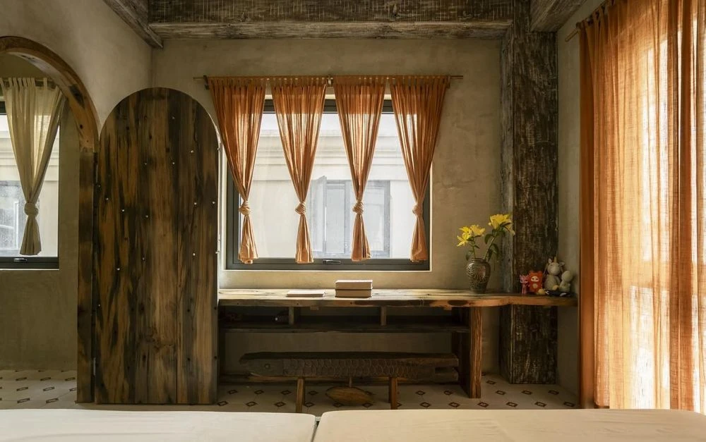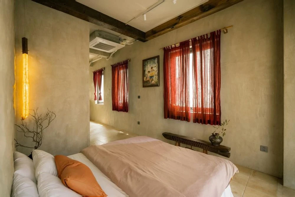 Không gian với tính cách thô mộc và những mảng màu mạnh cá tính . Nội thất gỗ Táu tái sinh từ thuyền cũ và đầy ắp đồ thủ công, vải lanh, đèn giấy,… biến nơi này thành một “hang động” đầy cảm hứng .