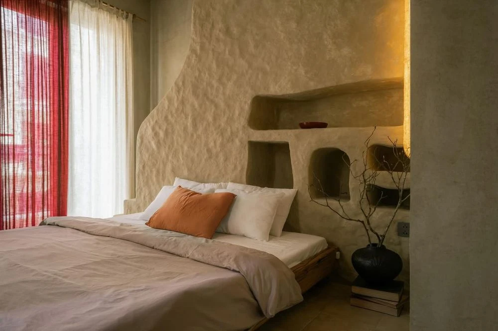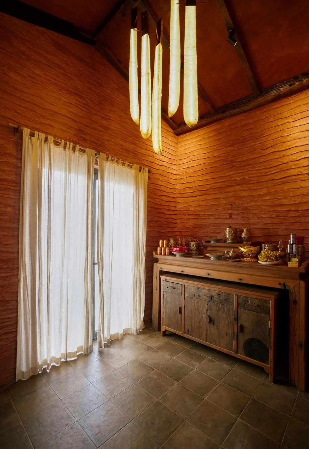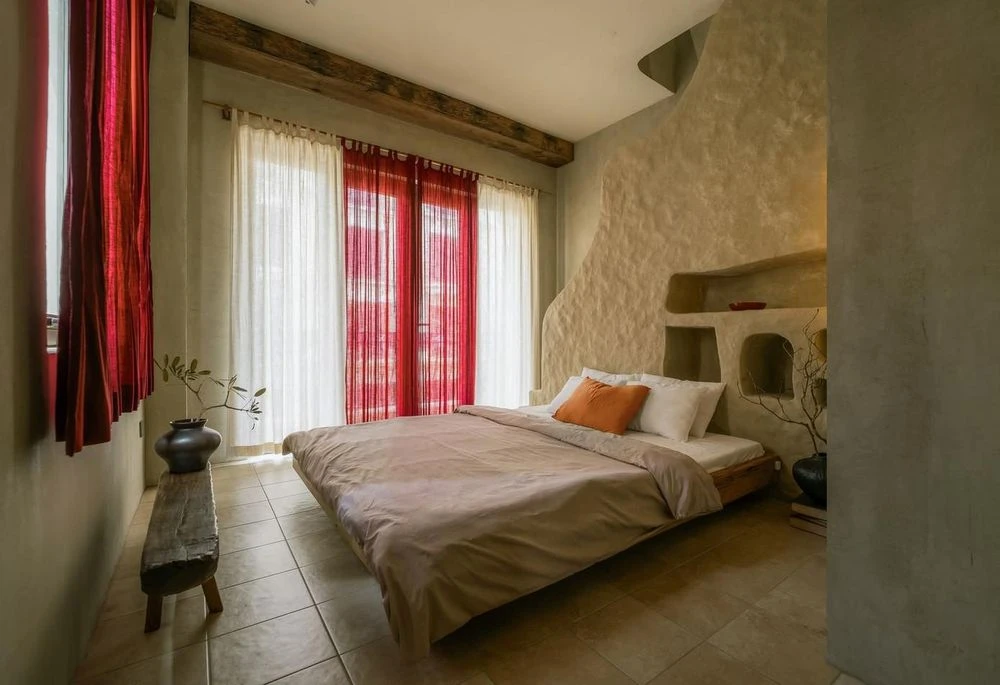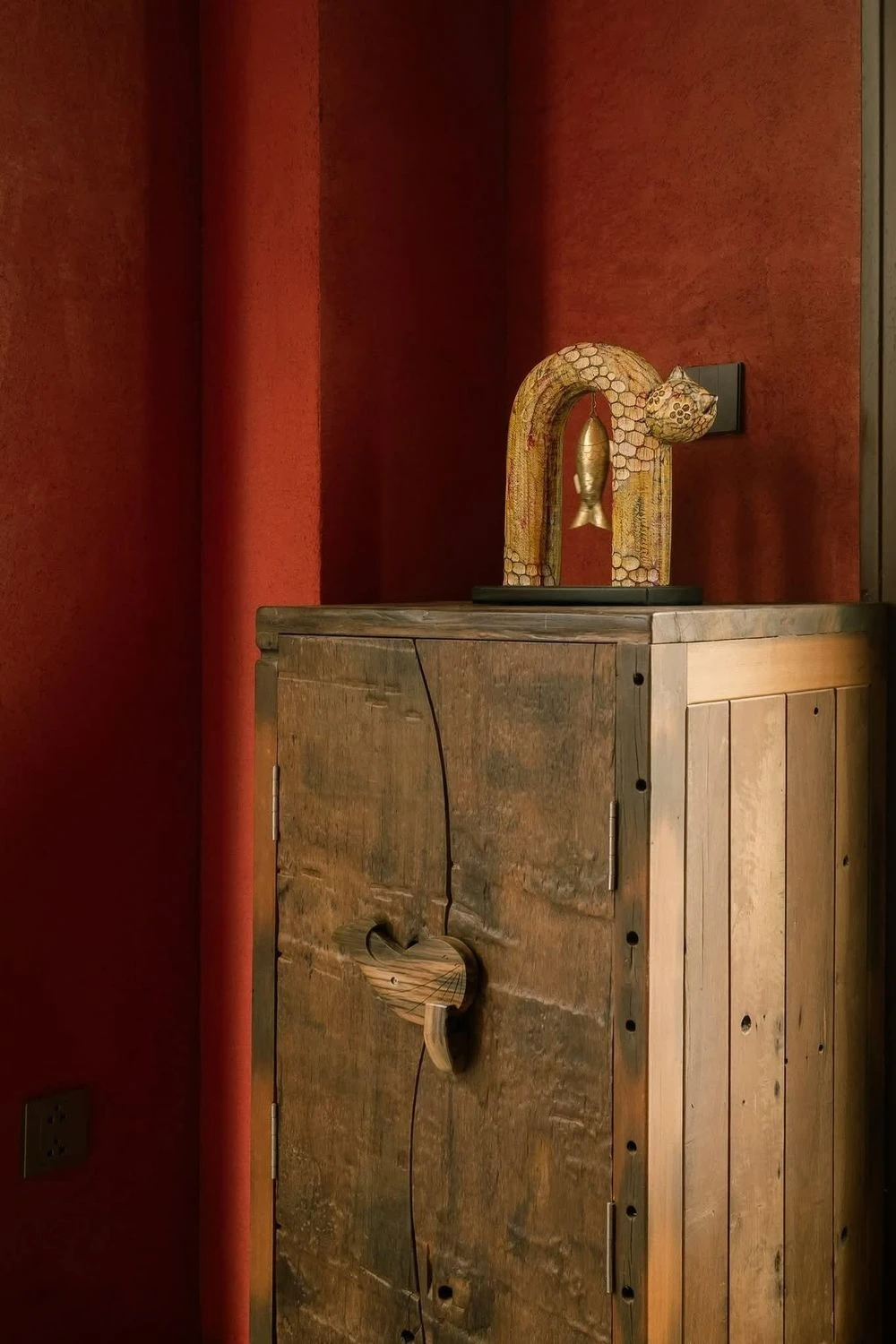 Không gian với tính cách thô mộc và những mảng màu mạnh cá tính . Nội thất gỗ Táu tái sinh từ thuyền cũ và đầy ắp đồ thủ công, vải lanh, đèn giấy,… biến nơi này thành một “hang động” đầy cảm hứng .