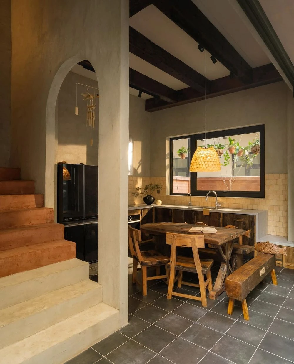 Tinh thần thô mộc không chỉ được thể hiện qua nội thất gỗ mà còn hiện diện qua tường hiệu ứng, vật liệu gạch, đá, đường nét bất đối xứng, bất toàn khắp mọi ngóc ngách.