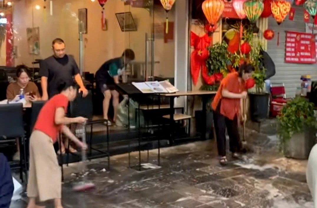 Hình ảnh nhân viên nhà hàng Lake View 1983 Traditional Vietnamese & Vegan Restaurant số 35 phố Hàng Khay đổ nước “đuổi” người dân ngồi chờ xem diễu binh (Ảnh: Cắt từ clip).