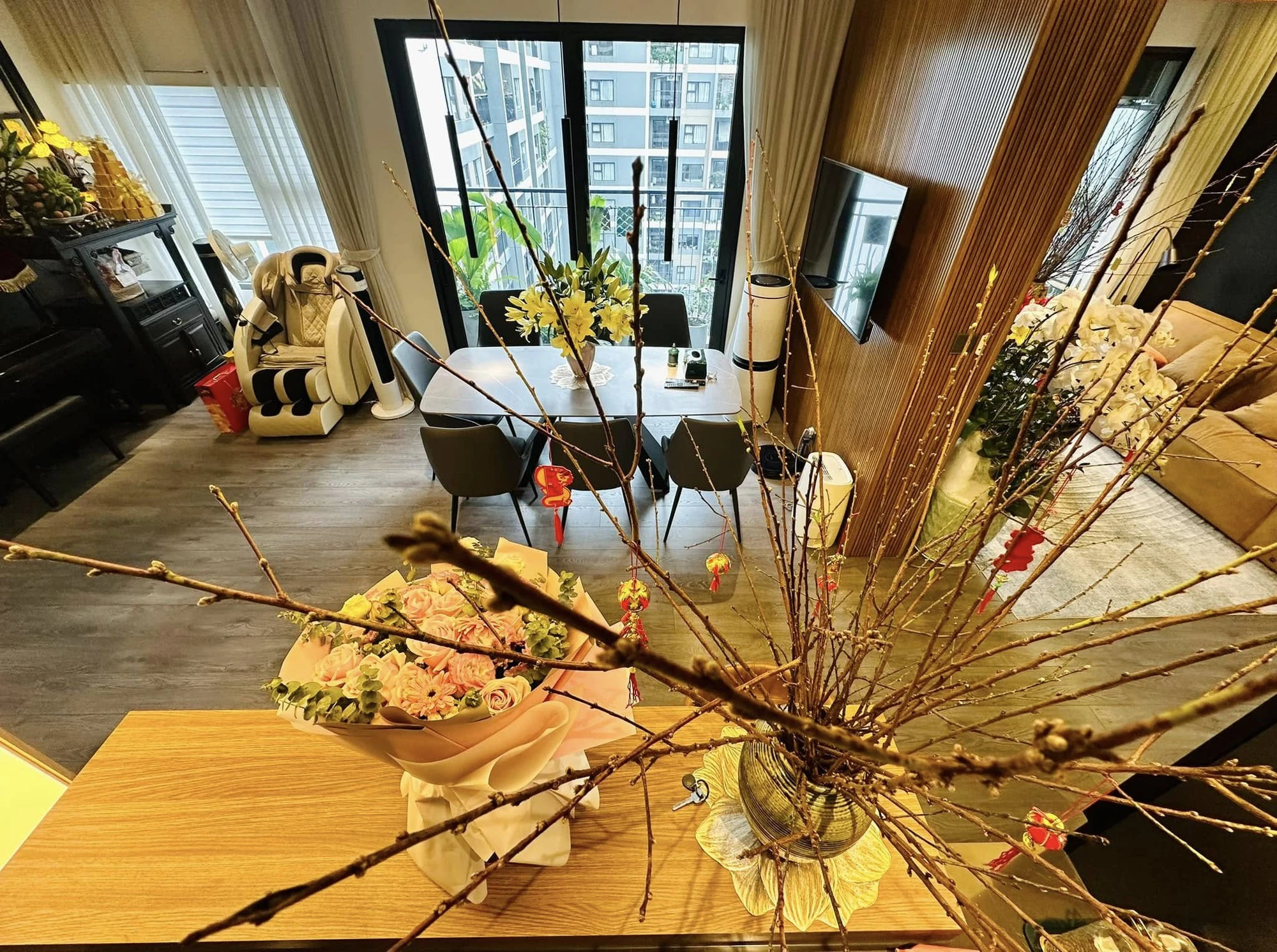 Được biết, nàng Vàng Anh và gia đình hiện đang sống trong căn hộ chung cư cao cấp, có diện tích 120m2, được đập thông từ hai căn chung cư. Căn hộ được thiết kế đẹp, sang chảnh như khách sạn với tone màu trầm, gỗ và kính được sử dụng xuyên suốt căn nhà, tạo nên cảm giác sang trọng nhưng không kém phần ấm cúng.
