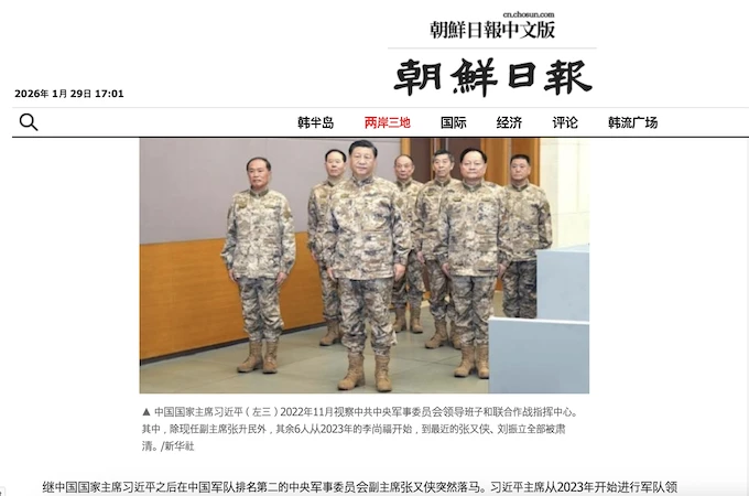 Ảnh chụp màn hình Sau khi Bộ Quốc phòng Trung Quốc vào ngày 24/1/2026 tuyên bố Uỷ viên Bộ Chính trị, Phó Chủ tịch Quân uỷ Trung ương Trương Hựu Hiệp và Ủy viên Quân ủy Trung ương kiêm Tham mưu trưởng Bộ Tham mưu Liên hợp Quân uỷ Trung ương Lưu Chấn Lập bị lập án điều tra vì nghi ngờ “vi phạm kỷ luật và pháp luật nghiêm trọng”, Nhật báo Triều Tiên đăng bài cho rằng Trương Hựu Hiệp và Lưu Chấn Lập không đơn thuần chỉ bị cáo buộc tham nhũng , mà còn liên quan tới chính trị.