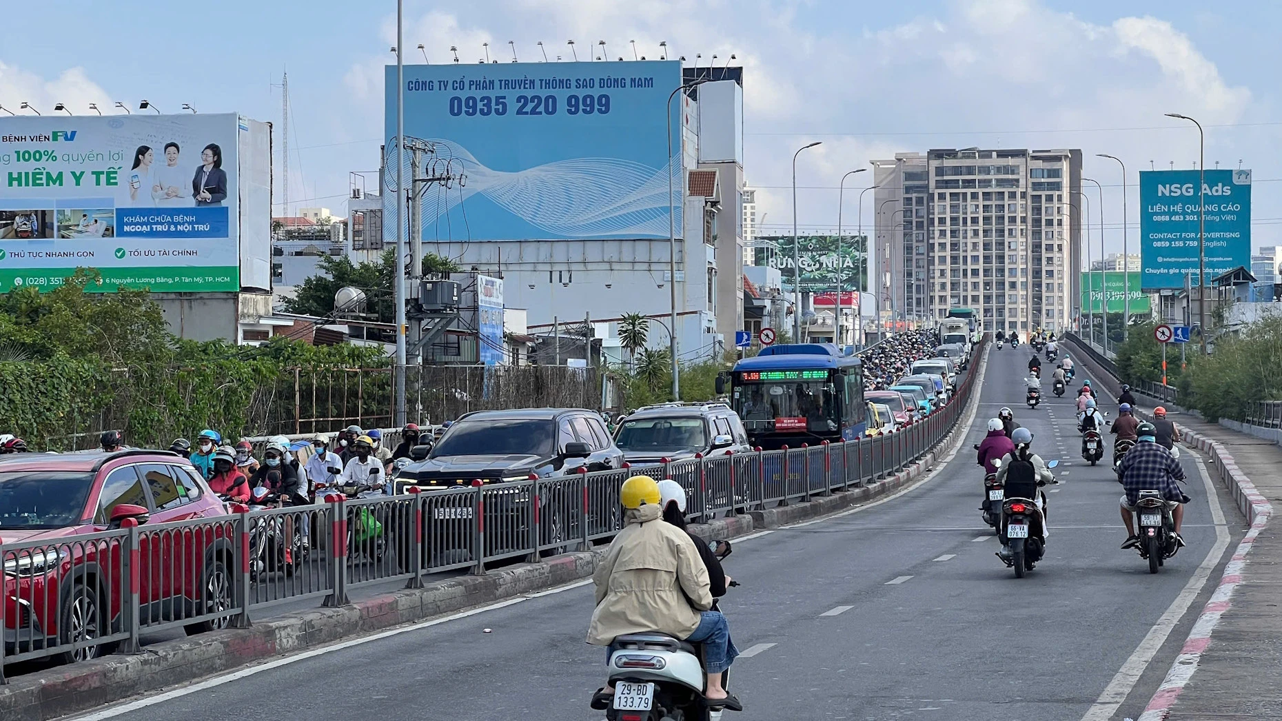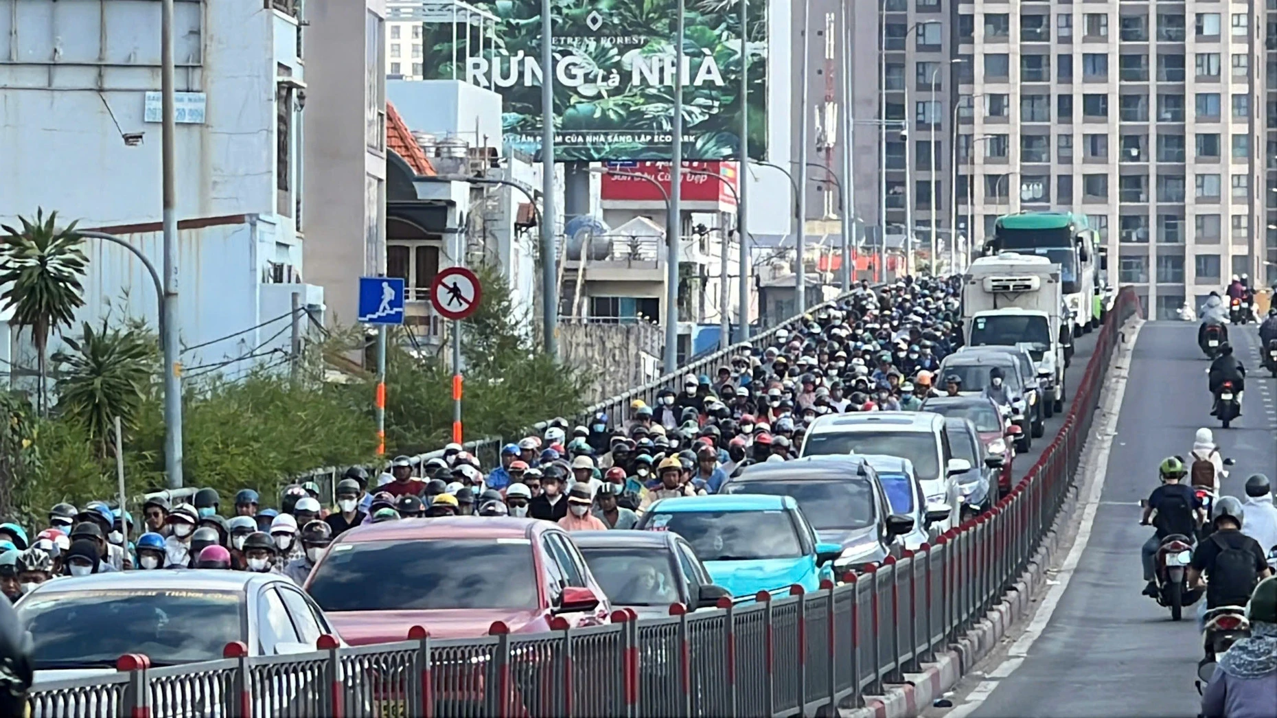 Tại giao lộ Ngô Thị Bì - Nguyễn Hữu Thọ, lực lượng chức năng vẫn đang gồng mình điều tiết giữa biển người và xe.