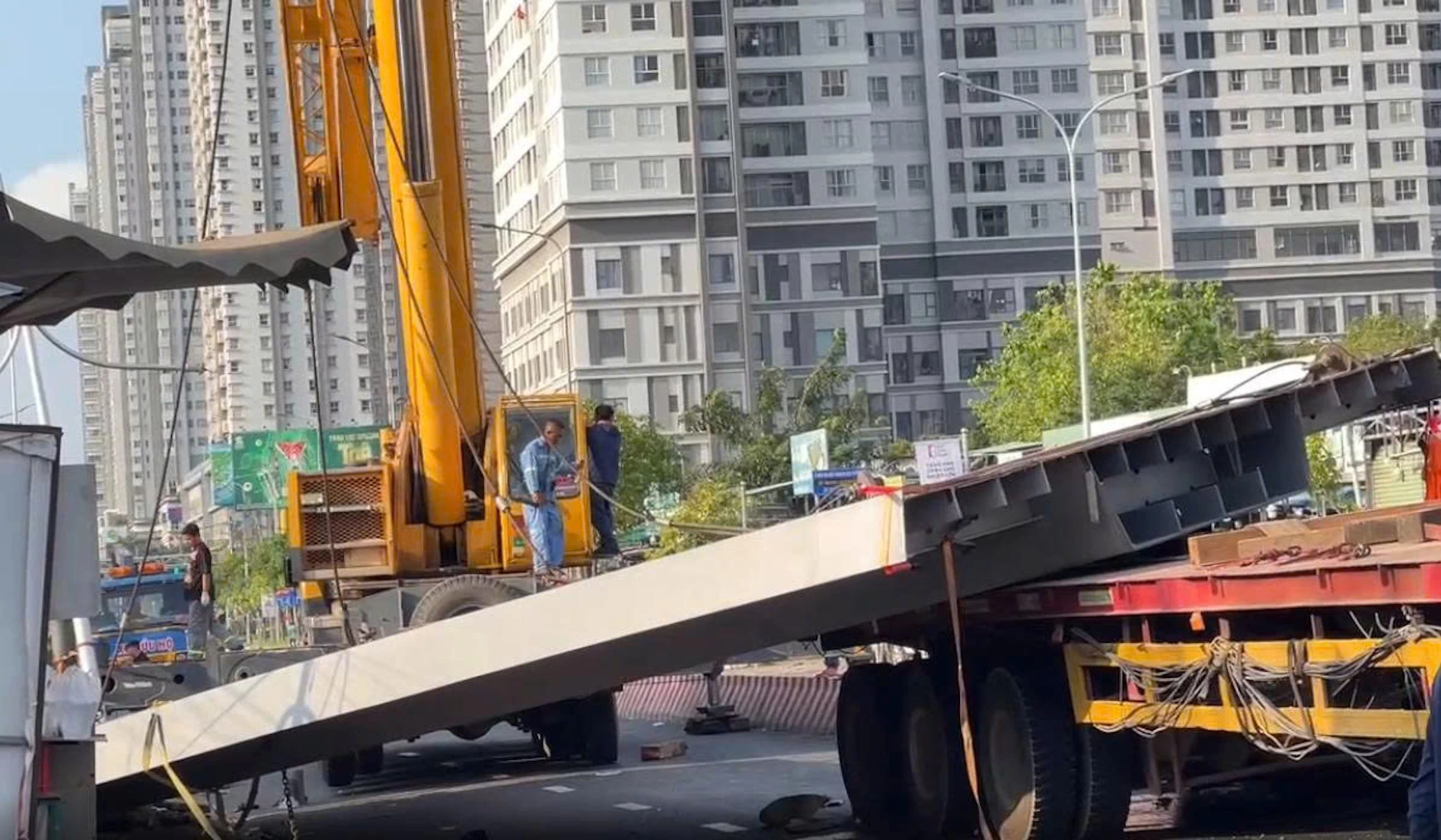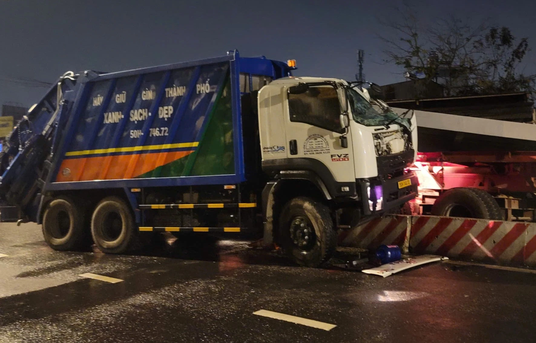 Nhịp dầm thép nặng khoảng 10 tấn, dài hơn 20m trên xe đầu kéo đổ ập xuống đường ở cửa ngõ TPHCM làm biến dạng cabin xe tải chở rác.