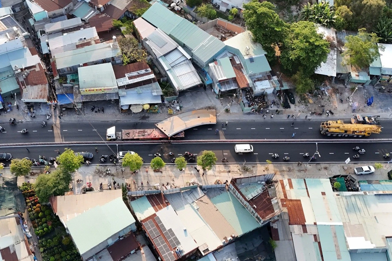 Nhịp dầm thép bị hất văng xuống, chắn hết phần đường Nguyễn Hữu Thọ theo hướng đi trung tâm TPHCM. Ảnh: TK