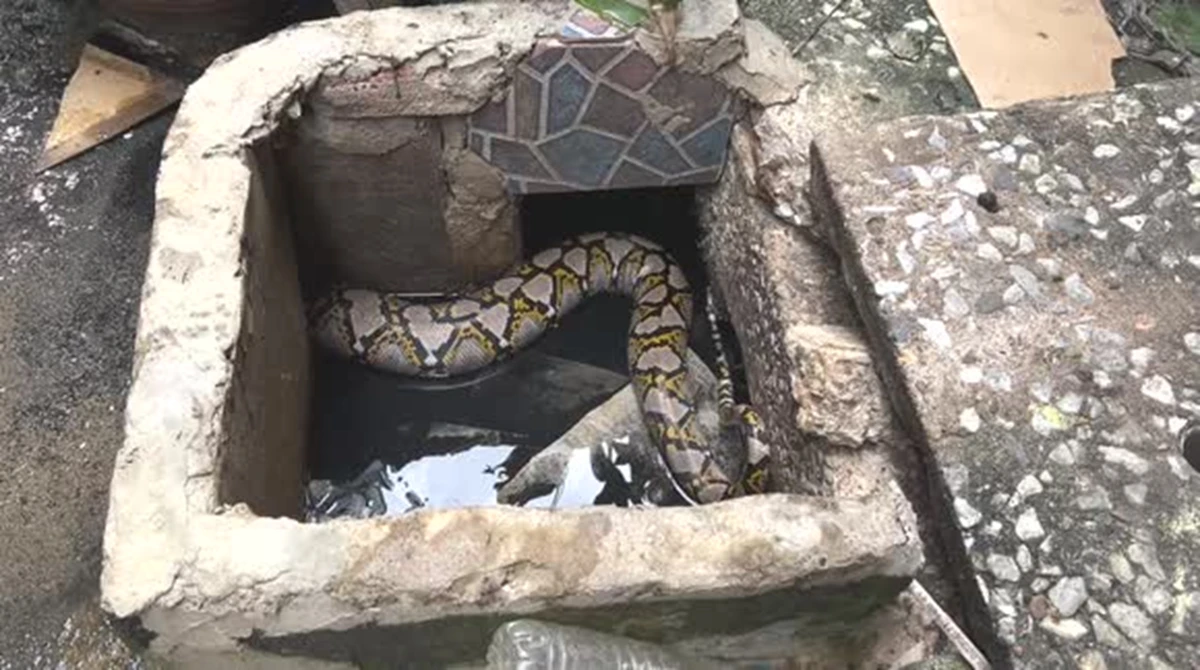 Một con trăn khổng lồ mắc kẹt bên trong một đường ống nước hẹp. Thấy vậy những người chủ gian hàng bị sốc đã gọi cho đội cứu hộ động vật , những người đã đập vỡ cống bê tông để lấy đường ống ra nơi con rắn bị mắc kẹt.