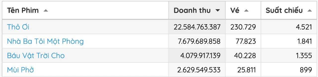 Thỏ ơi bứt tốc đứng đầu phòng vé, vừa cán mốc 100 tỷ đồng sau 3 ngày khởi chiếu. Tác phẩm của Trấn Thành áp đảo hoàn toàn suất chiếu so với ba đối thủ. Trong khi đó, Mùi phở - bộ phim khai thác chất liệu gia đình Bắc bộ, lấy món phở làm biểu tượng văn hóa – chỉ thu hơn 10 tỷ đồng sau ba ngày ra rạp.