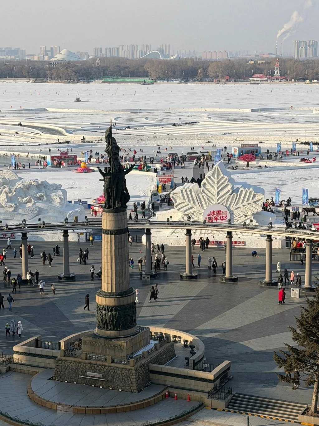 | Đài tưởng niệm Chống lũ năm 1958 và Lễ hội Băng tuyết nhìn từ sân thượng sảnh khách sạn Indigo Harbin. (Ảnh: Xiong Yang) |