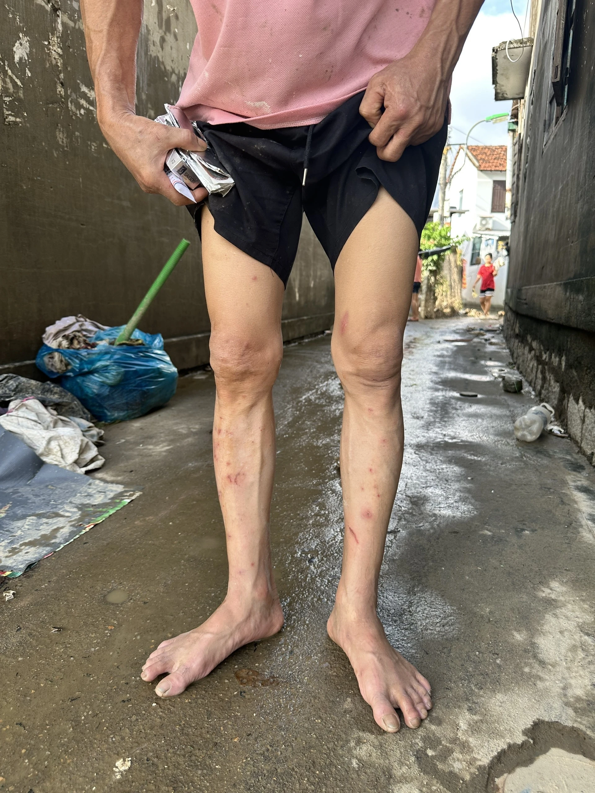 “Em coi chân anh nè, không có chỗ nào lành lặn. Đêm đó, nếu anh không đu người vào bình nước rỗng, cột một sợi dây vào nắp bình, sau đó bơi ra khỏi nhà, vừa bơi vừa bám vào các nhà xung quanh… chắc gì anh đã còn đứng đây. Đây, đồ anh mặc cũng là đồ từ thiện, nhà anh chẳng còn một thứ gì…” , người đàn ông dáng nhỏ nhắn, nói liên lục khi bất ngờ có người hỏi về “đêm hôm ấy”. Anh dường như chưa lúc nào bớt căng thẳng sau đêm sinh tồn trong mực nước cao gần 3m.
