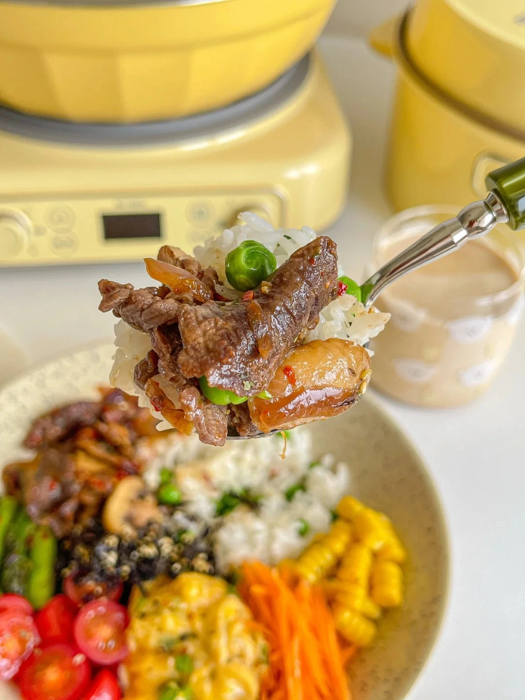 Những ngày bận rộn, tôi chỉ cần một công thức đơn giản nhưng đủ chất là cơm đậu xanh ăn kèm bò xào nấm , trứng mềm và ly latte nóng . Ăn sạch mà vẫn ngon, vừa tiết kiệm thời gian vừa khiến tâm trạng tươi mới cả ngày.