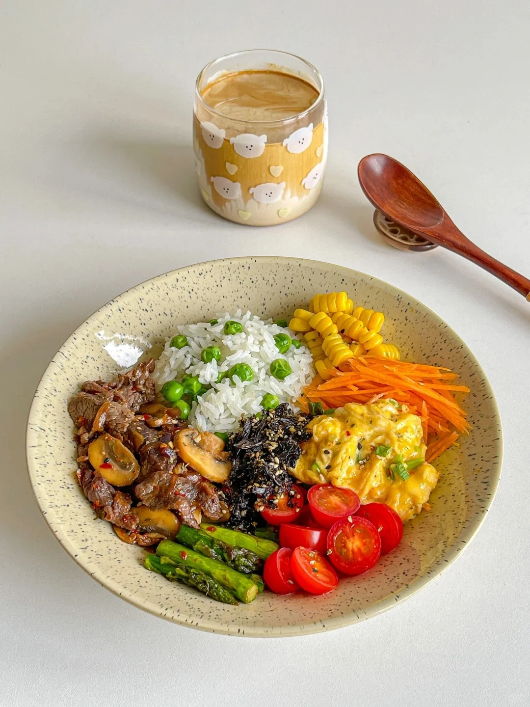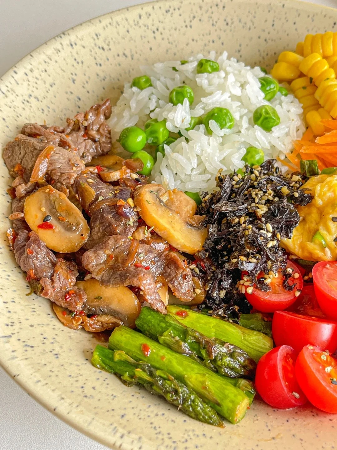 Tất cả các nguyên liệu sau khi hoàn thành được tôi bày ra đĩa như một “bữa ăn quản lý” chuẩn chỉnh: Một góc là cơm đậu xanh nóng hổi, bên cạnh là bò xào nấm thơm cay nhẹ, trứng mềm phủ hành, vài miếng cà chua bi đỏ mọng, vài thanh măng tây xanh, hạt ngô vàng xen lẫn cà rốt cam. Tôi rắc thêm ít vụn rong biển để món ăn vừa có vị biển nhẹ, vừa thêm phần bắt mắt.