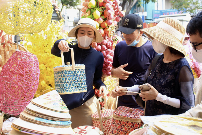 Giữa đợt Covid-19 bùng phát trở lại, nhiều khách đi mua đồ trang trí đều đeo khẩu trang để phòng dịch. Sau khi mua hàng, nhiều người cũng tranh thủ check-in, chụp ảnh kỷ niệm.