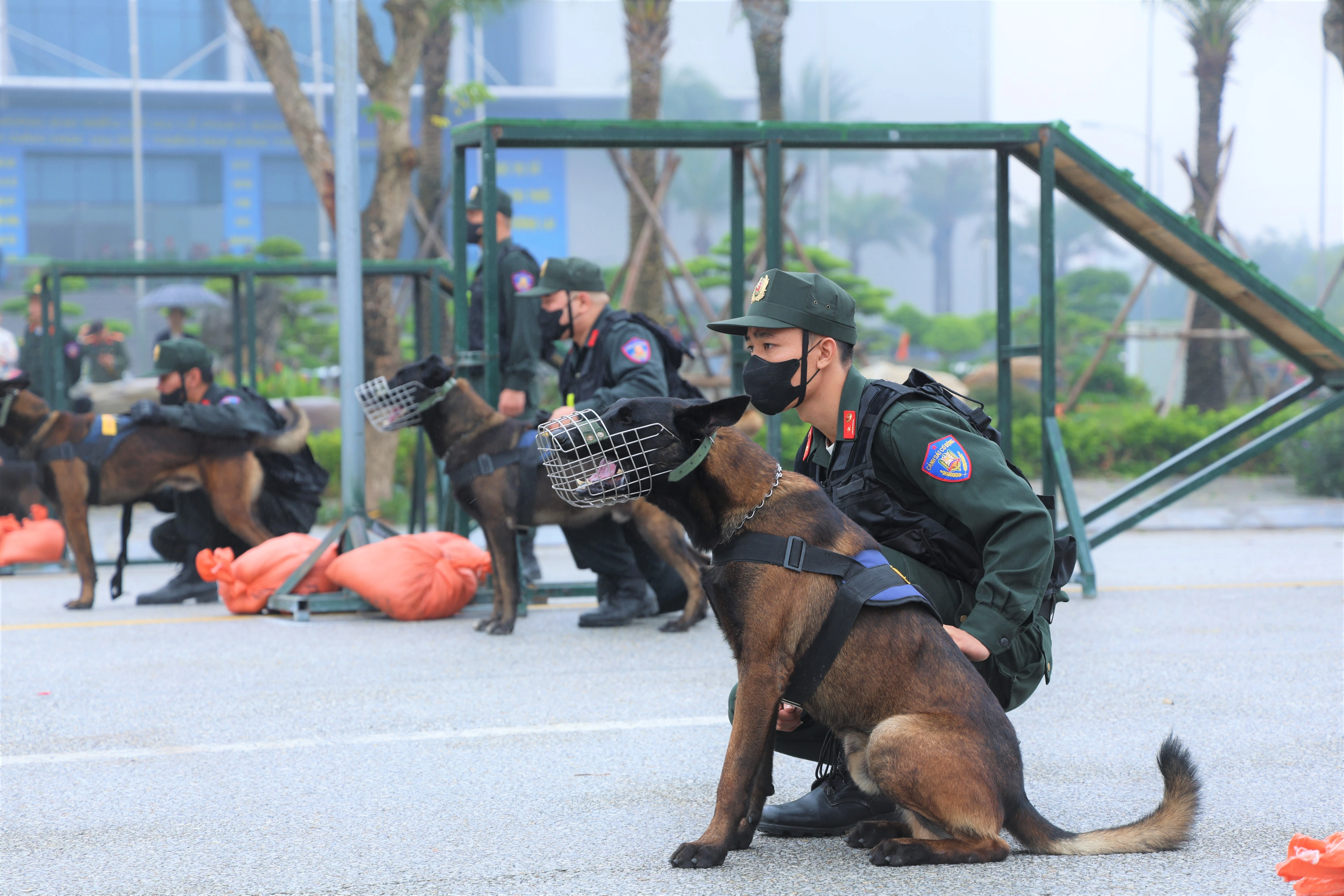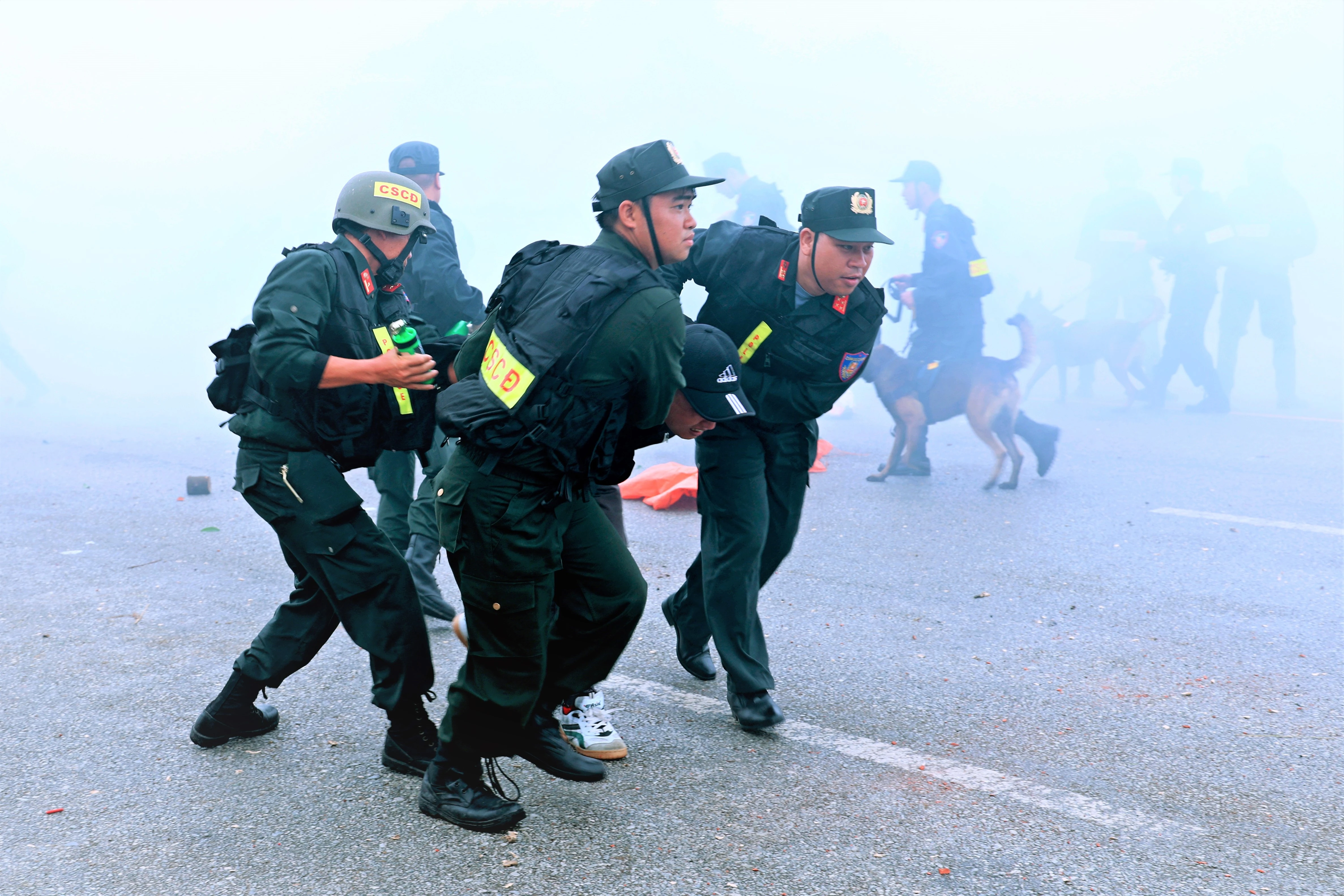 Lực lượng cảnh sát cơ động dùng chó nghiệp vụ diễn tập trong tình huống giả định, thể hiện sự đa dạng nghiệp vụ trong công tác huấn luyện và chiến đấu.