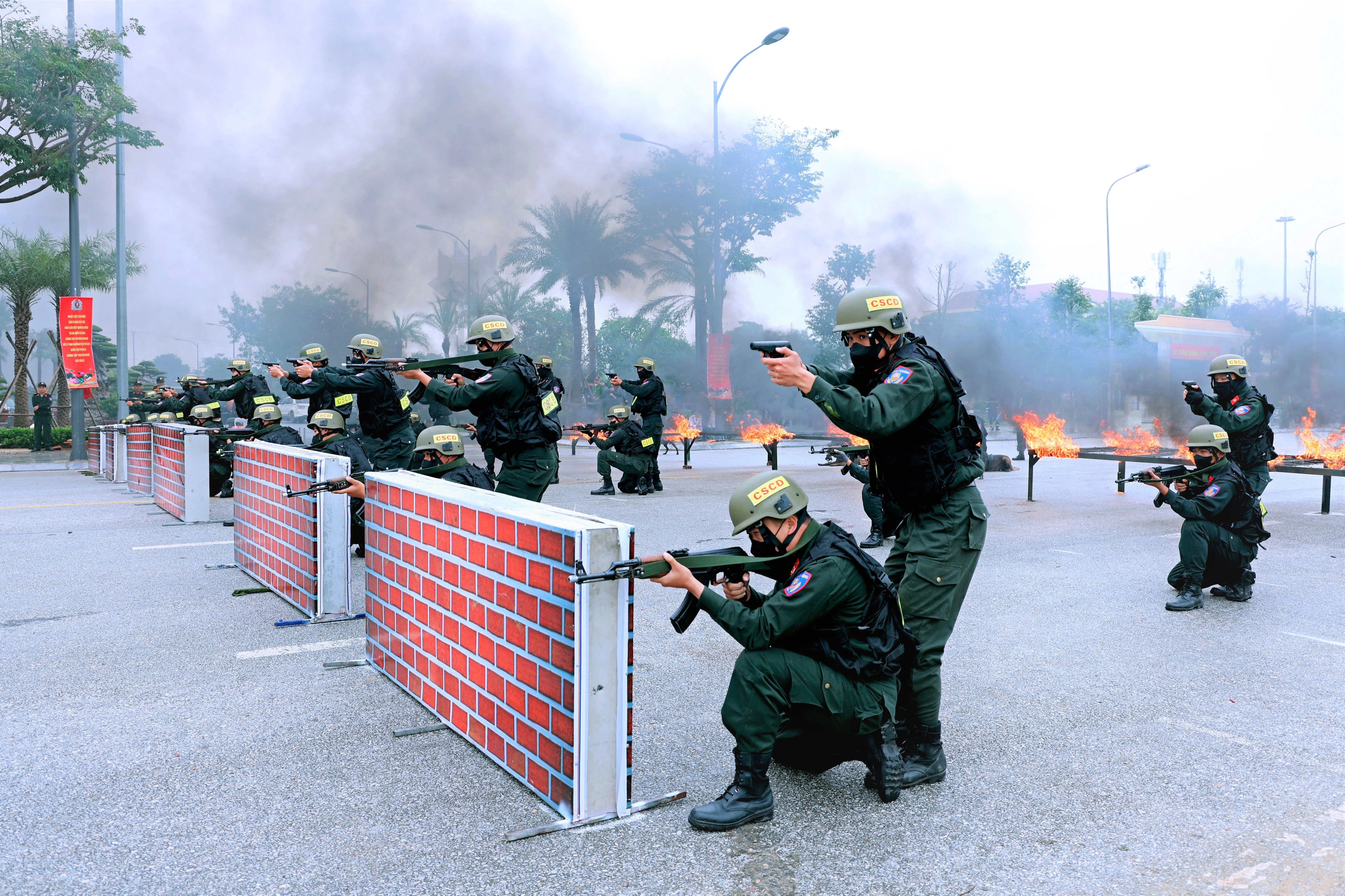 Báo cáo kết quả huấn luyện, các lực lượng tham gia thực hành với phần đồng diễn võ thuật, phân thế, xử lý tình huống, biểu diễn khí công, công phá, kỹ chiến thuật vượt vật cản lao vòng lửa.