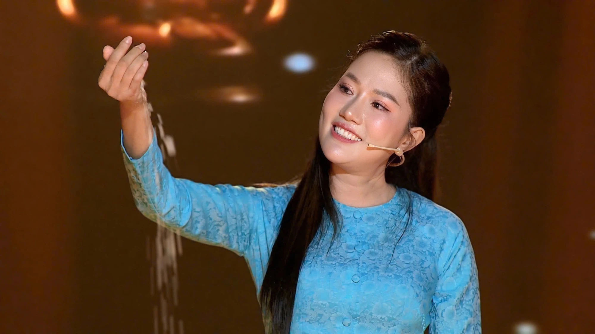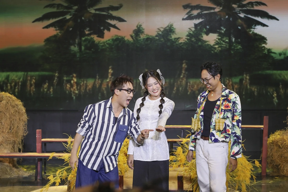 Điểm nhấn trong đêm thi chính là khi nữ MC duyên dáng bất ngờ hóa thân thành diễn viên hài, tung hứng cùng Lâm Nguyễn và Năm Chà. Màn phối hợp ăn ý, đầy dí dỏm này khiến khán giả tại trường quay bật cười thích thú. Không dừng lại ở đó, Huỳnh Thơ còn khéo léo lồng ghép vọng cổ vào tiết mục và thậm chí thử sức với phần rap, mang đến một màu sắc mới lạ.