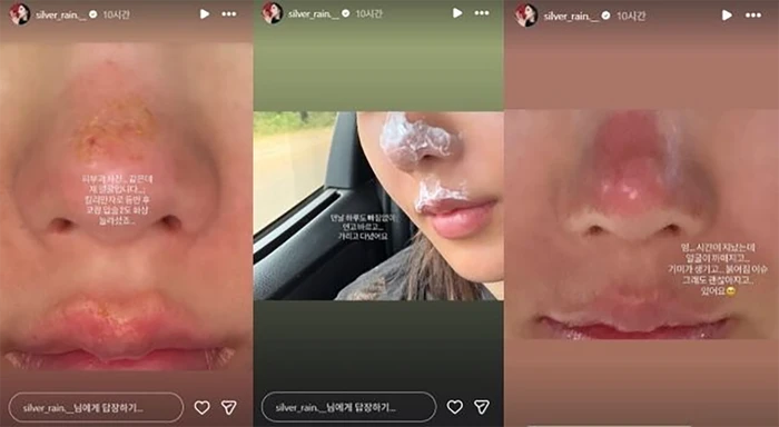 Cụ thể, Kwon Eun Bi đăng tải trên mạng xã hội dòng trạng thái hài hước: “Ta-da! Em đã quay lại rồi! Cái mũi của em đây!” , kèm theo loạt ảnh hiện tại và ảnh chụp thời điểm da bị tổn thương nặng. Trong những bức hình được chia sẻ, phần da quanh mũi và môi của nữ ca sĩ bong tróc, đỏ rát rõ rệt, khiến nhiều fan không khỏi xót xa.